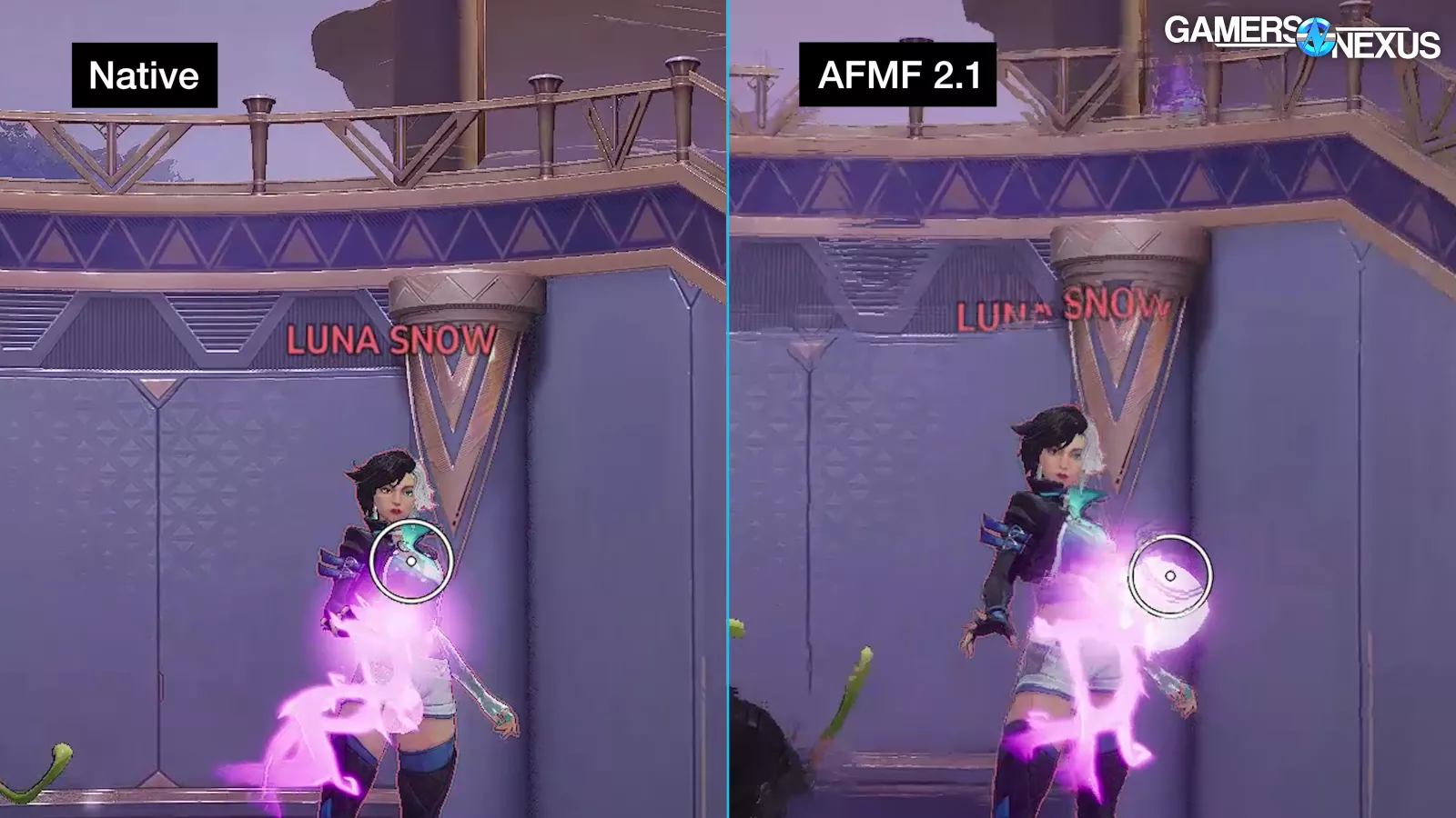 Notice also that with AFMF, Luna Snow's nametag is distorted on the first frame where the camera shakes, which is a further disadvantage of AFMF versus in-game frame generation. Using the in-game option, the nametag is preserved.