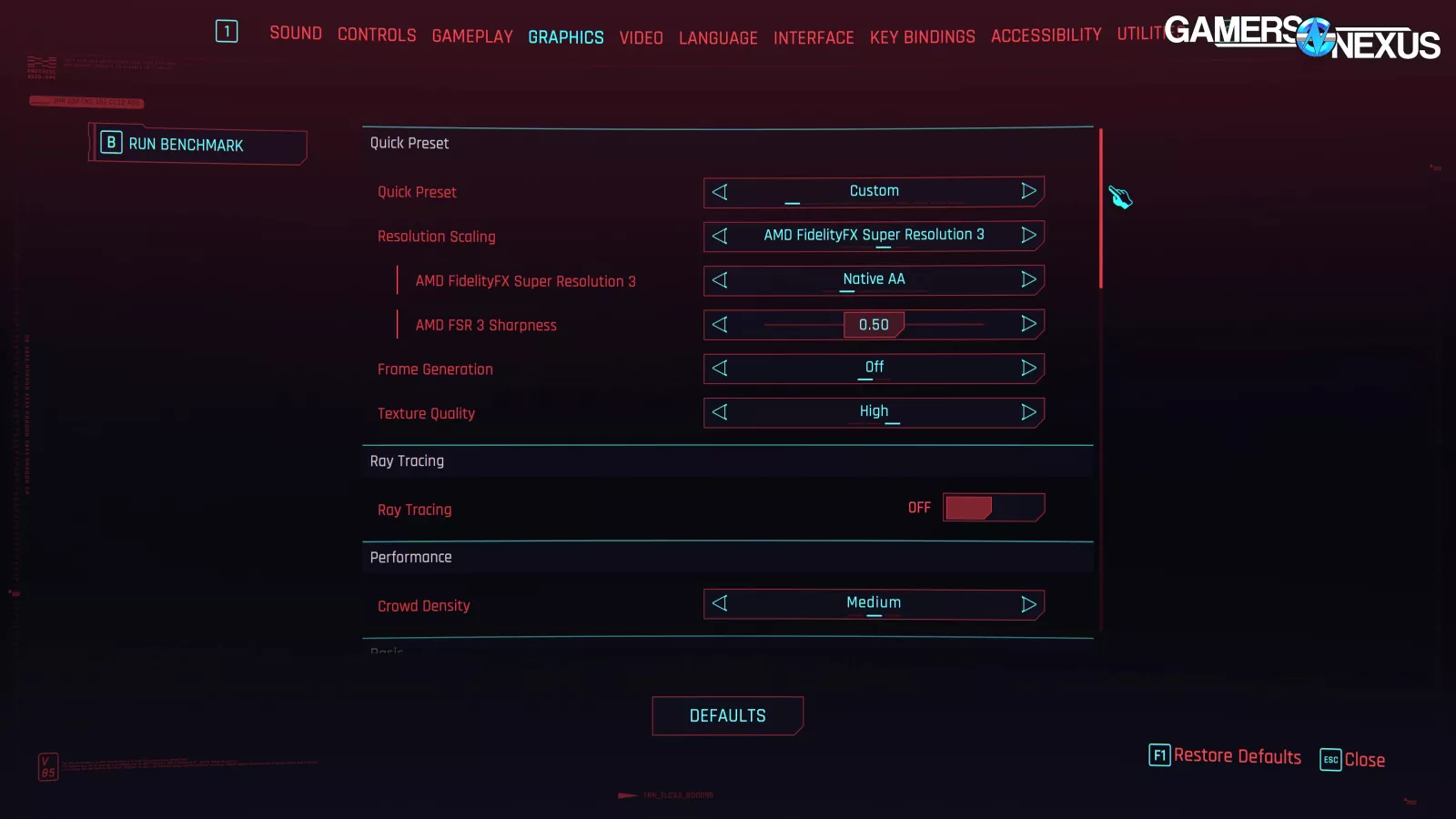 In Cyberpunk, we used the High preset without ray tracing and set FSR 3 to Native AA, since FSR was required in order to enable in-game framegen.