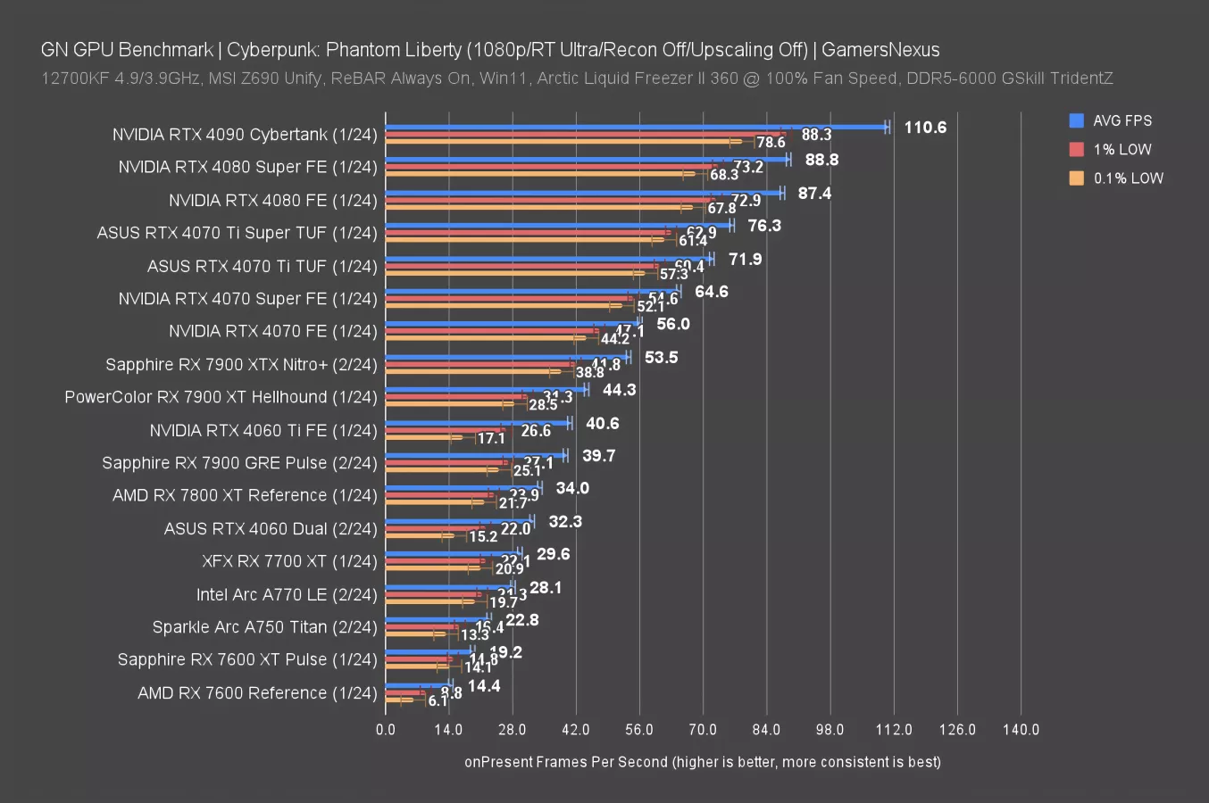 At 1440p, the 7900 GRE’s 91 FPS AVG has it just behind the 4070 Ti and Ti Super and leading the 4070 Super by 5%, reduced from 9% at 4K. This continues NVIDIA’s trend of sometimes suffering disproportionately at higher resolutions.
