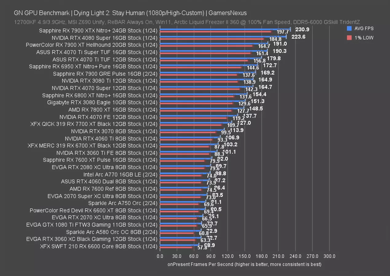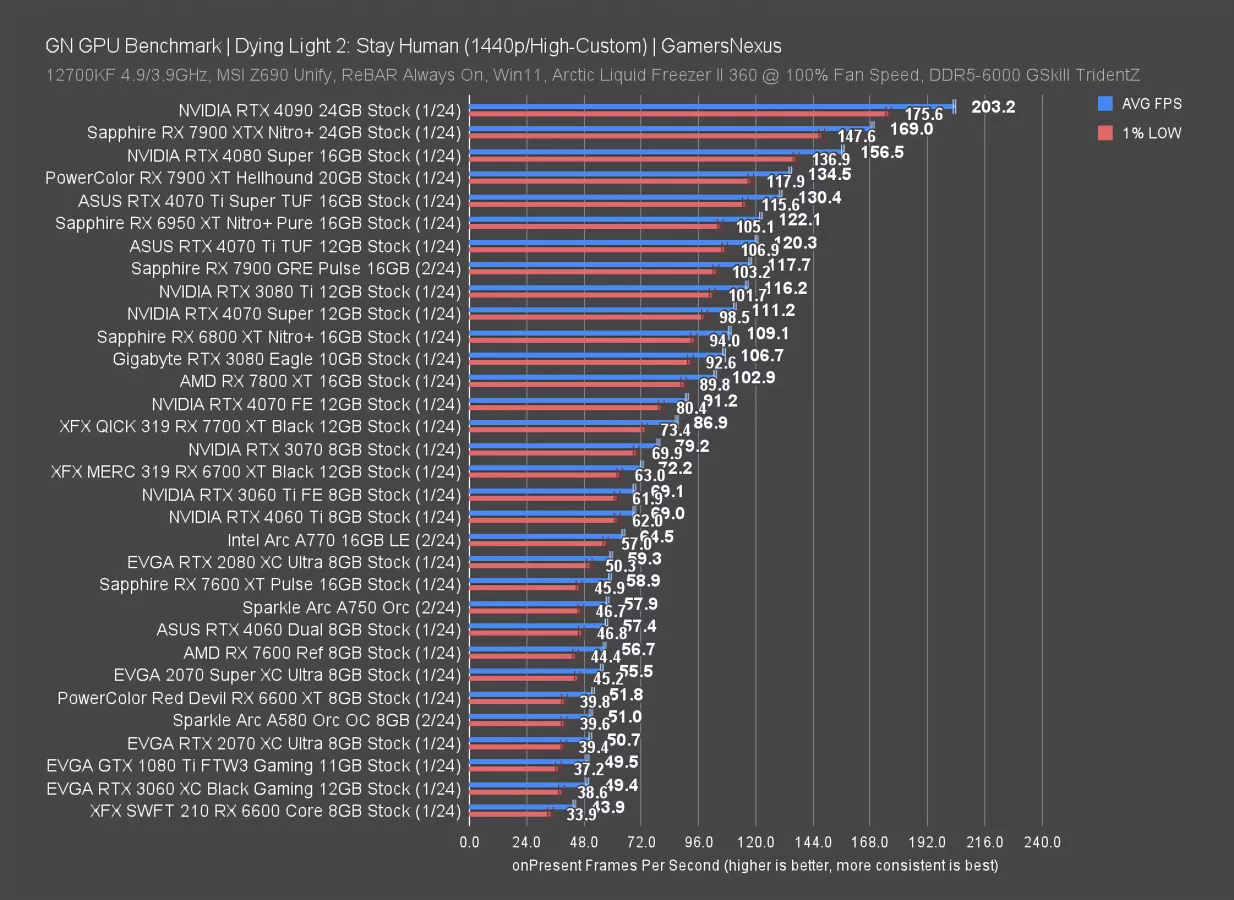 Dying Light 2 is up now. At 4K, the RX 7900 GRE ran at 58 FPS AVG, which has it just barely hitting the minimum that most people target for framerate. Settings adjustments would fully accommodate 60 FPS. That has it about equal to the 4070 Ti and just ahead of the 4070 Super; however, realistically, all 3 of these devices produce about the same experience.