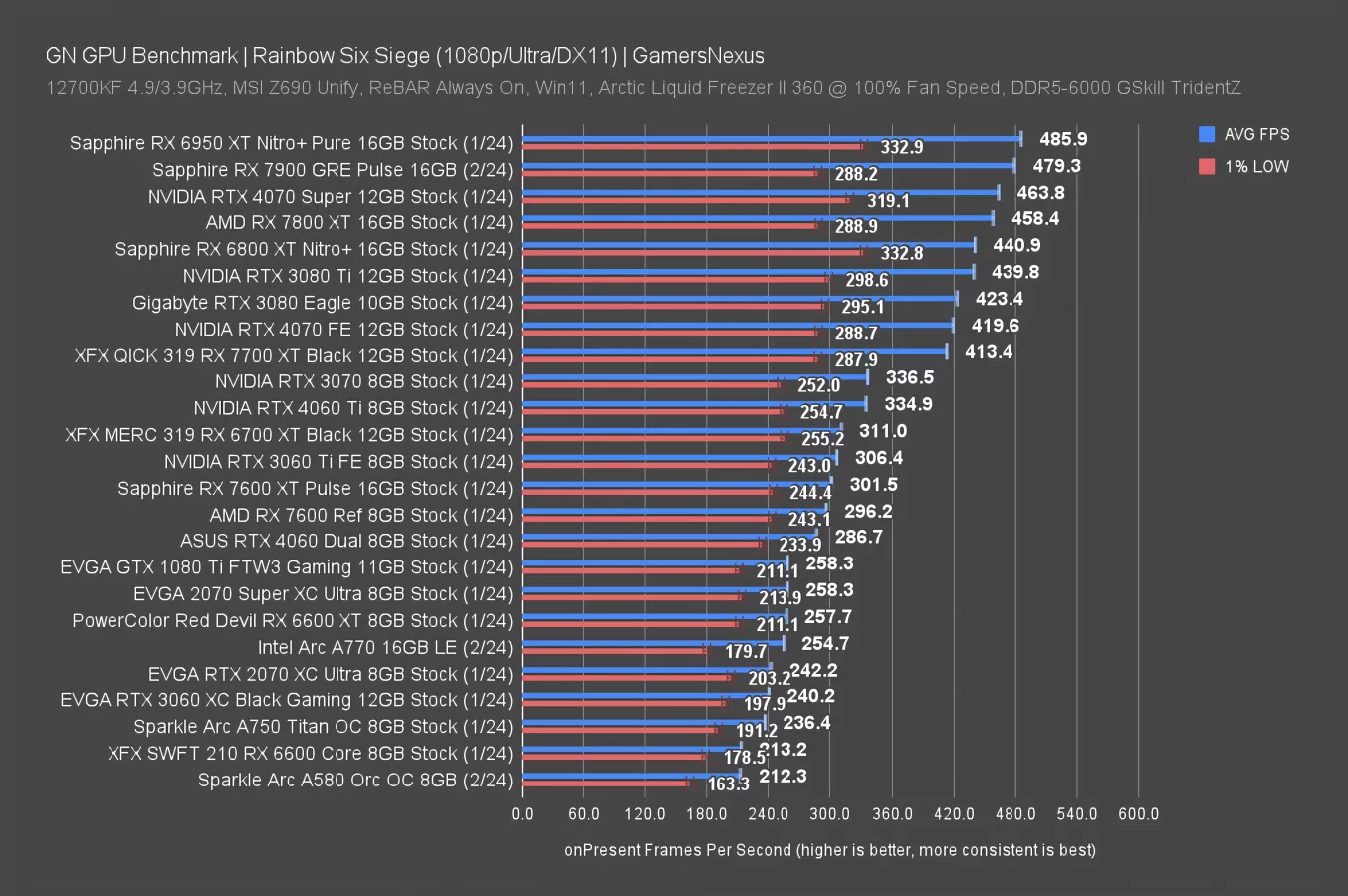 That means the 4070 Ti Super leads by 13%, with the 7900 XT 17% ahead of the 7900 GRE. Lower down the stack, the 6800 XT remains an impressive performer and sits just below the 4070 Super, with the 7800 XT at 198 FPS AVG, giving the 7900 GRE a 13% lead.