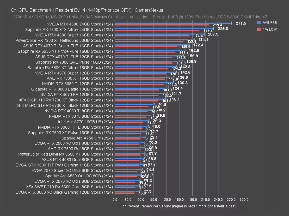 In Resident Evil 4 at 1080p, the RX 7900 GRE landed at 223 FPS AVG, which has it between the RTX 4070 Super and the RX 6950 XT (watch our review). The 6950 XT was about $600 when we last saw it available new. The 4070 Super is currently $590 to $600, so the 7900 GRE ends up cheaper here while outperforming the 4070 Super by 3.1%. It’s not likely to be noticeable, but it is a real advantage (and the price is noticeable).