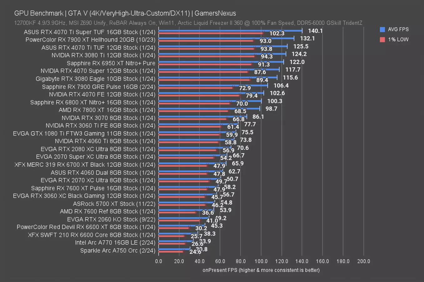 GTA V at 4K is one of the charts we keep around for generational comparison data because our results don’t ever change -- you can see the 5700 XT here as an example of that.