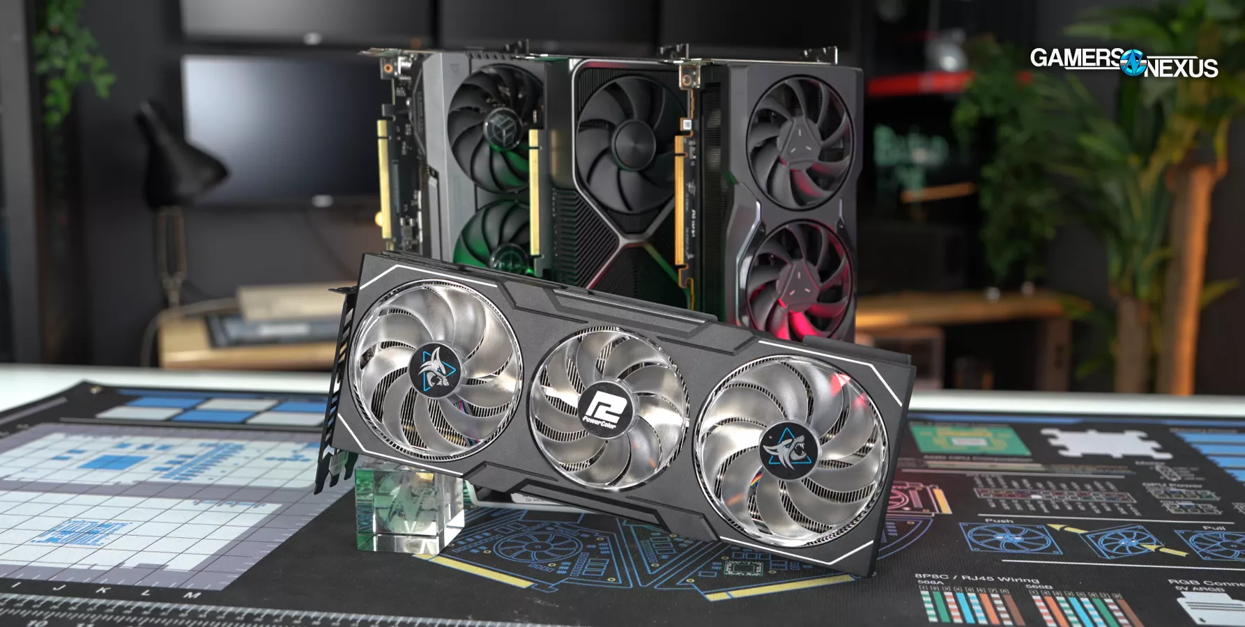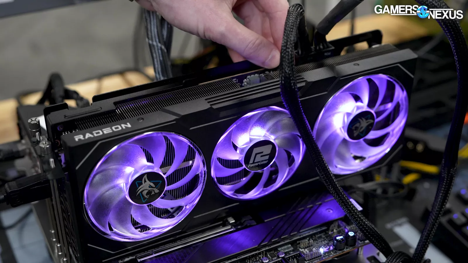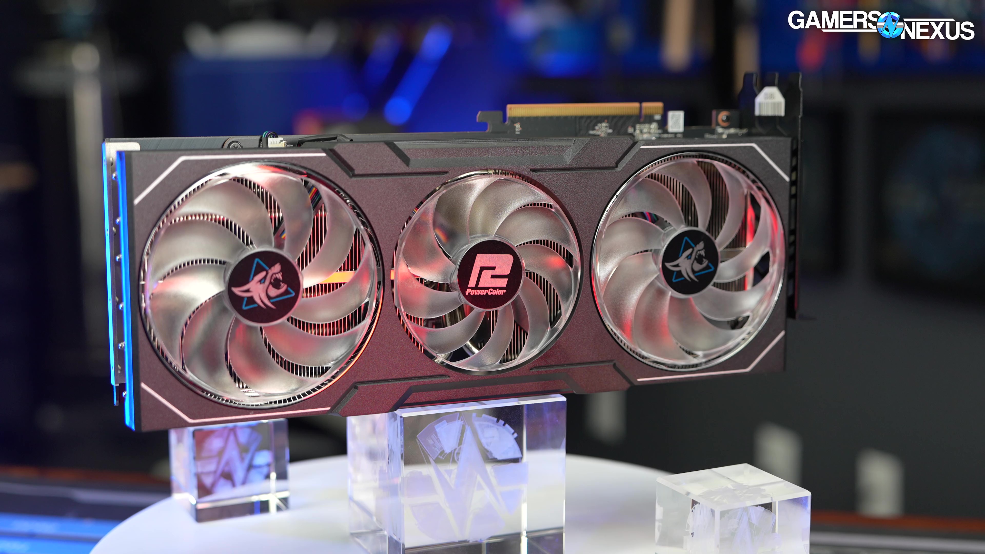 This review will specifically test the PowerColor RX 7900 XT 20GB Hellhound model, which is one of the cheaper ones regularly available in the US. The Hellhound uses a 3-fan cooling solution, has a dual VBIOS switch, and has a physical toggle for LED control (with three pre-programmed options: purple, blue, or off - the rest is done via software). Testing largely focuses on value today of an RX 7900 XT in general, but we also included frequency analysis for the clock, thermals, and power consumption.