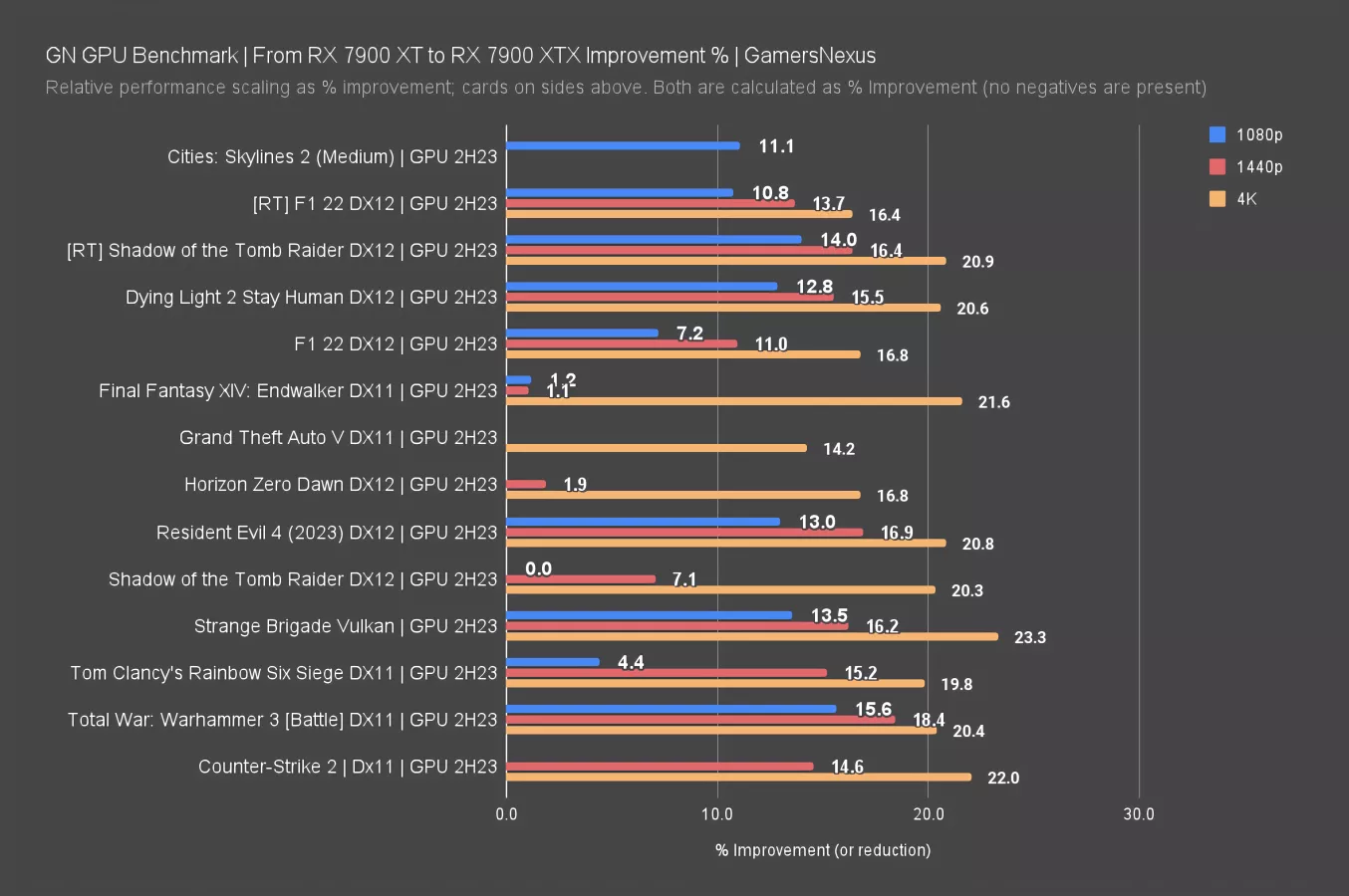 Here’s a comparison chart. The bar represents the percent uplift of the AMD RX 7900 XTX over the XT.