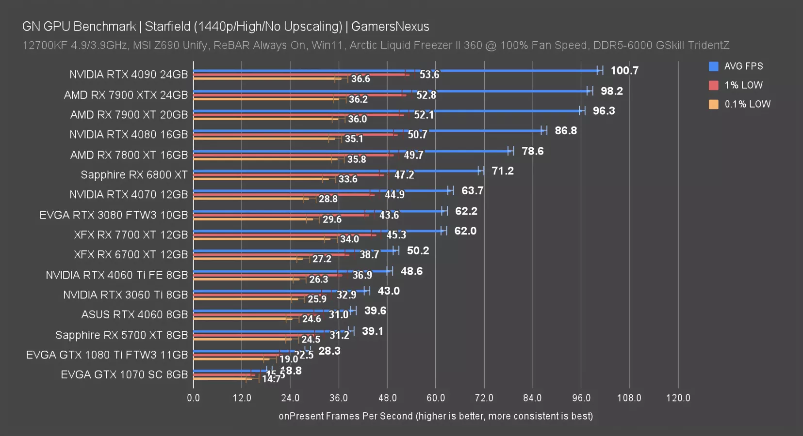 In Starfield at 4K/High, we had the 7900 XTX at 74 FPS AVG and the 7900 XT at 64 FPS AVG. That’s a 15% improvement with the XTX. The 4080 is left in the dust by the 7900 XTX, which has a 27% lead. The XT has an 11% lead.