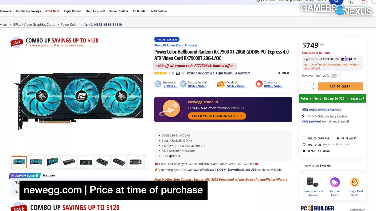 The cheapest SKU we could find was the RX 7900 XT Hellhound. The pricing has been all over the place lately, unfortunately. We purchased it when it was $720, which was a $30 instant promo stacked on top of a seemingly new $750 baseline price. Apparently that was an incredibly narrow window though, because by the time we finished our in-depth testing of the card and writing the review, the price had changed again. And not just the promo price, but the entire price: On all US retailers we had checked, the price climbed from $720 discounted and $750 baseline to a new $800 baseline.