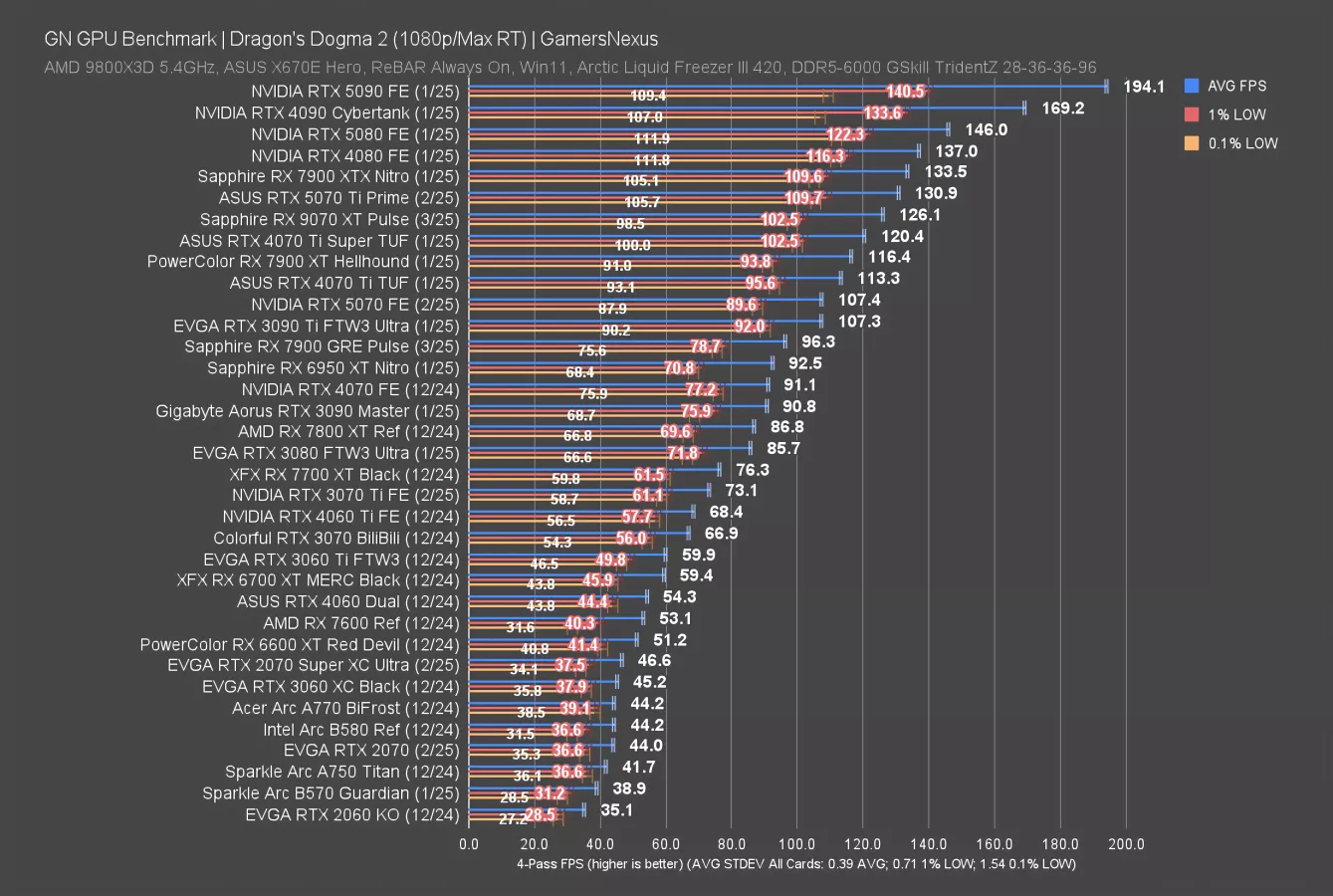 At 4K, the 9070 XT landed at 68 FPS AVG. Unfortunately for AMD, that means that the 9070 XT is worse than the RTX 5070 here. The 5070 leads the 9070 XT by 13.6% with its 78 FPS AVG; the 5070 Ti leads by a staggering 43%, at 97 FPS to 68. Whereas Dragon’s Dogma 2 was a strong position for AMD, it’s weak in this game. It all depends on the game itself.