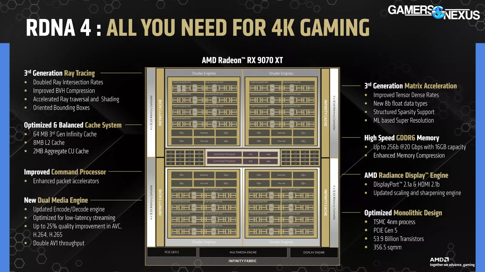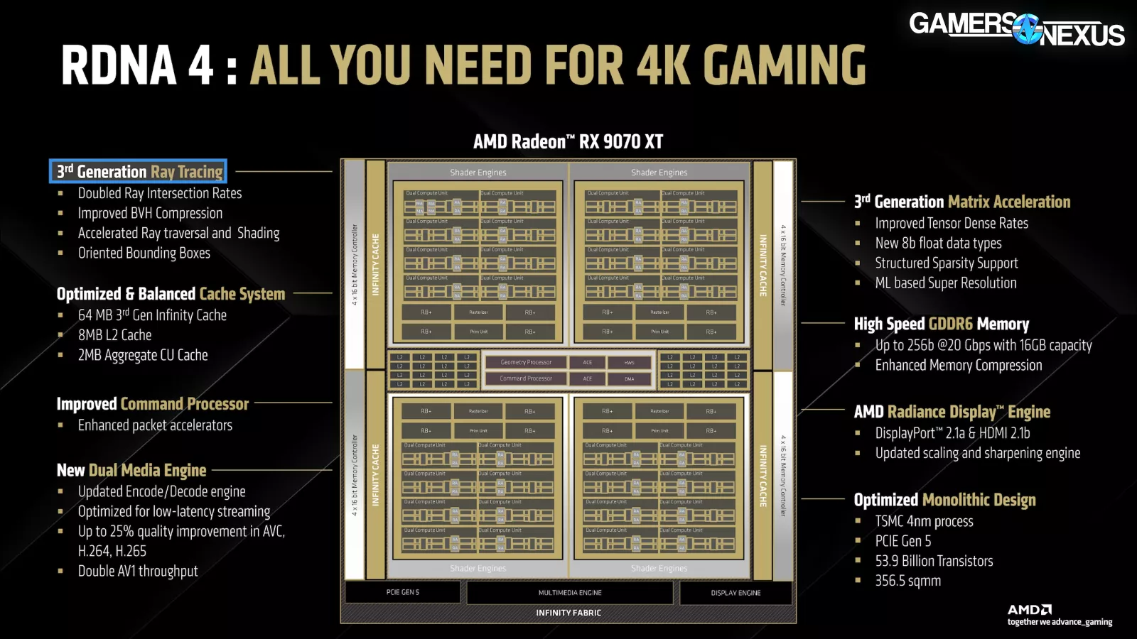 AMD has made major changes architecturally for the RDNA 4 generation, which the 9070 XT uses. There are 2 cards: the 9070 and 9070 XT. There’s probably going to be another card later that's at the lower end. The basic specs of the cards today might feel familiar to the Vega era, though: The cards are divided by a 56 compute unit (CU) model and 64 CU model with today’s review focusing on the 64. No, not that one. We’ll also have the 9070 review up shortly.