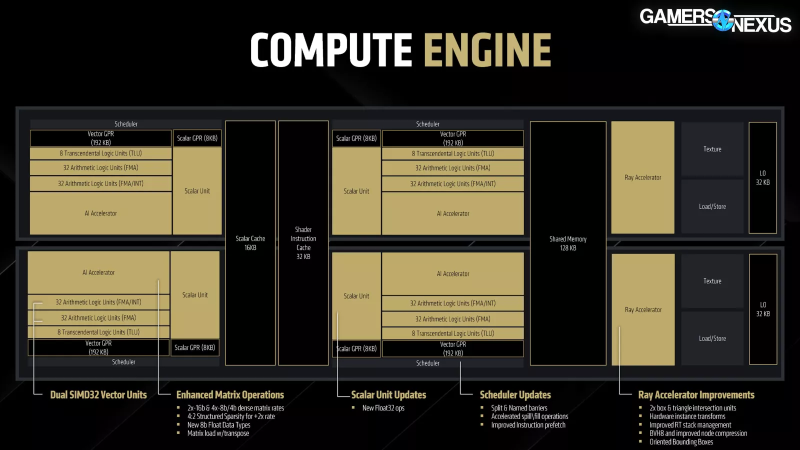 The architecture’s biggest overhaul that we’re aware of has been in ray tracing. AMD has doubled the ray intersection rate, moved to two RT accelerator blocks with a shared 128KB memory, moved to BVH8, and introduced oriented bounding boxes to reduce or eliminate false positives in ray-triangle and ray-box intersections. AMD also introduced a dedicated ray transform block to help with transformation. This is all stuff that AMD needs to improve upon because NVIDIA has successfully sort of manufactured a category it’s really good at, which is real-time ray tracing.