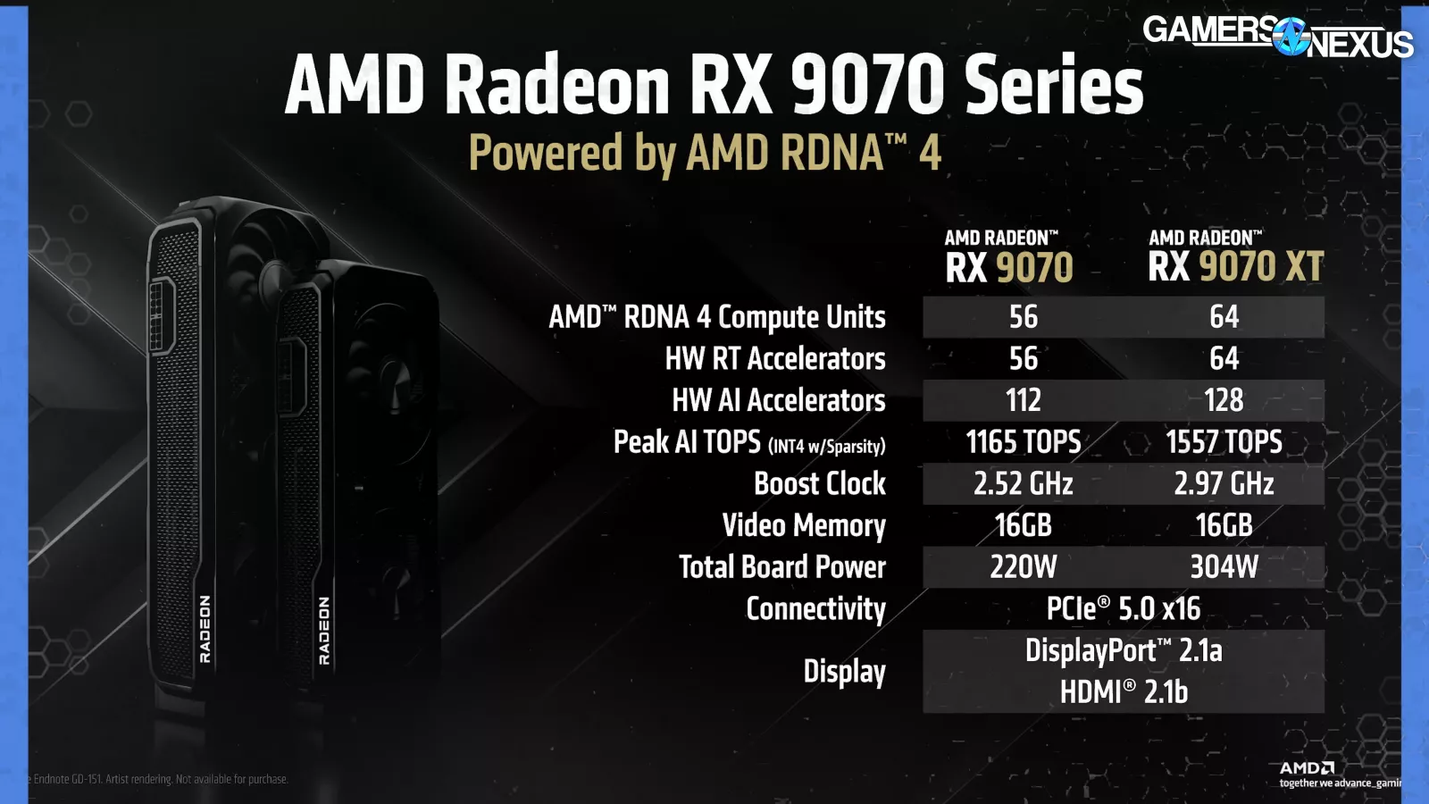 For TDP, AMD markets them at 220W and 304W, with board partners having room to scale higher. We’ll test this in our review. AMD is using GDDR6 memory at 16GB capacity at 20 Gbps and on a 256-bit bus for both cards. The VRAM alone will be advantageous in heavier RT workloads, which is something we talked about in our 5070 review.