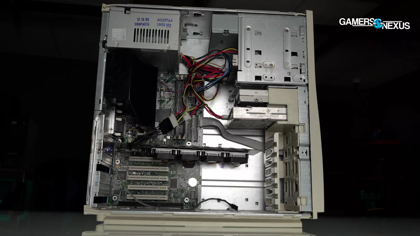 The motherboard was DOA, but our friends at the Kramden Institute were generous enough to send us an extremely beige 1999-vintage Dell Dimension XPS T600 as backup, and they even waived the $4 scrap price. Out of the box, it came with a 600MHz Pentium III, 128MB of RAM, a Cirrus Logic PCI GPU, a 10/100 NIC, and a 10GB hard drive, all of which was still functional. We upgraded it with a viewer-donated e-waste 800MHz CPU and some memory harvested from a crumbling homemade RAM Christmas wreath.