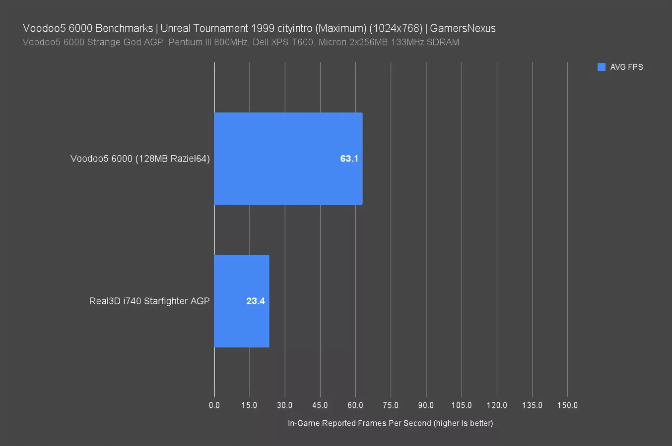 For comparison, we're testing a couple of roughly contemporary AGP cards sent to us by viewers: the 1998 Real3D i740 Starfighter (one of the cards that 3dfx helped to kill) and the 2000 NVIDIA GeForce 2 GTS (one of the cards that helped to kill 3dfx).