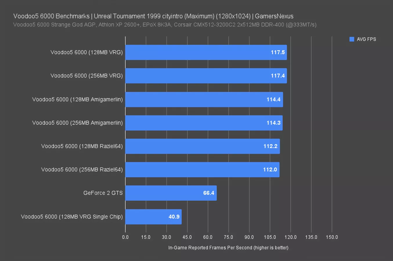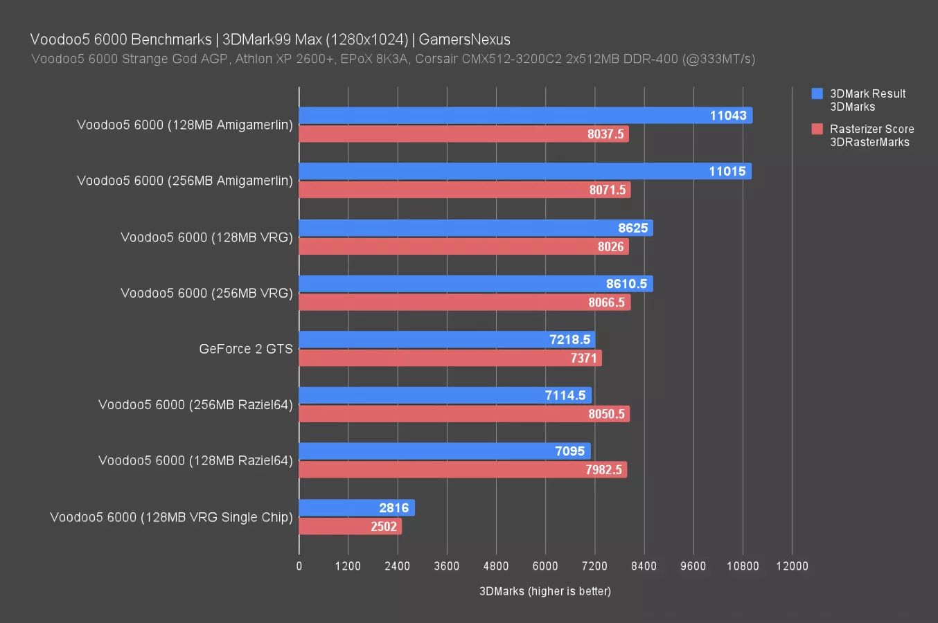UL hosts free licensed copies of legacy Futuremark suites going all the way back to the original 3DMark99 DirectX 6 benchmark. 3DMark has been a DirectX-only benchmark since its inception, so this test doesn't favor Voodoo as much as the games we selected.