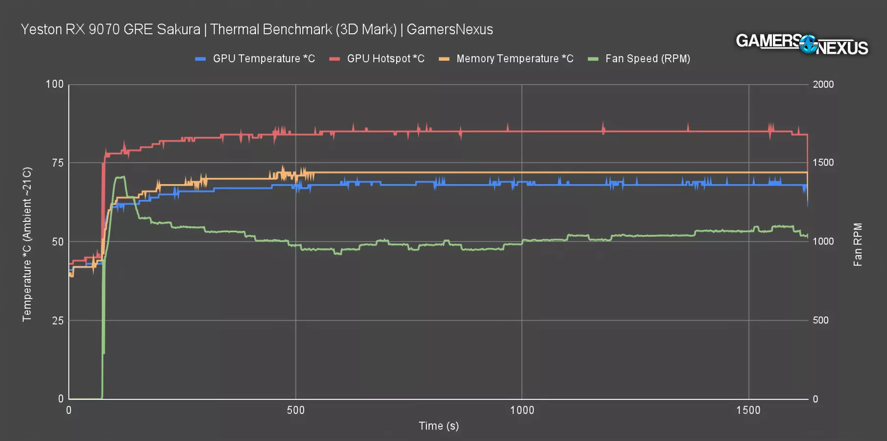 The 9070 GRE ran a GPU temperature of about 68 degrees Celsius in an ambient of 21 degrees. Yeston is aggressively targeting a low GPU temperature here, although it’s benefitted by the TDP of the card being just 220W. GPU temperature is good, but the hotspot temperature delta is problematic at about 16-17 degrees Celsius for a hotspot of 85 degrees. 85 is fine for the hotspot, but the high delta between the average GPU temperature and the peak shows that Yeston could improve in its cooler. Typically in further testing, we find that this is in either the mechanical mounting solution for pressure distribution or in the coldplate contact and flatness. Our tear-down will find more detail to explore here.