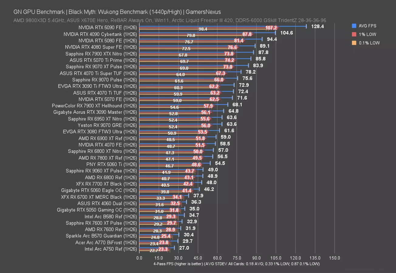 At 1080p, the 9070 GRE is in a playable position at 71 FPS AVG, just behind the 3090 and ahead of the 7900 XT. These are all about the same, including in lows. The 5070 leads the grouping, including a technical but irrelevant victory over the 9070 Pulse. The 5060 Ti gives the GRE about a 14% advantage.