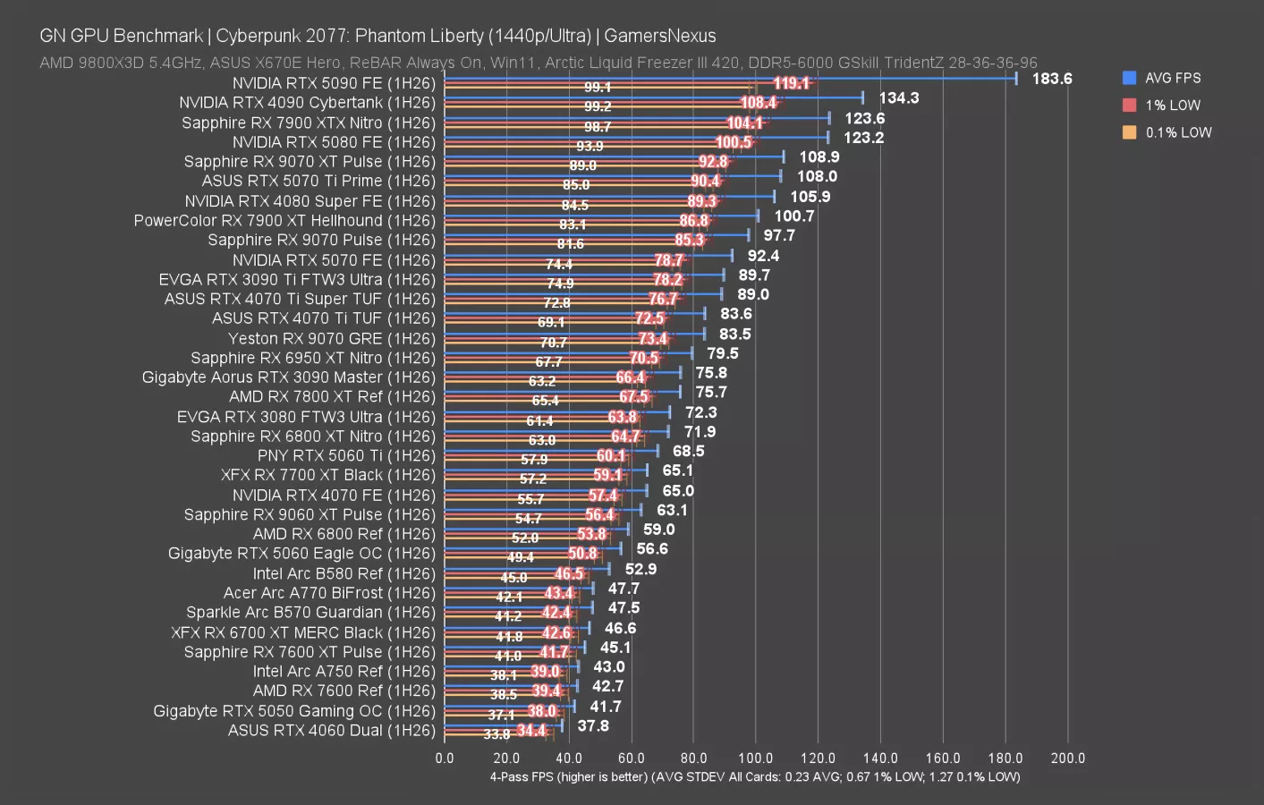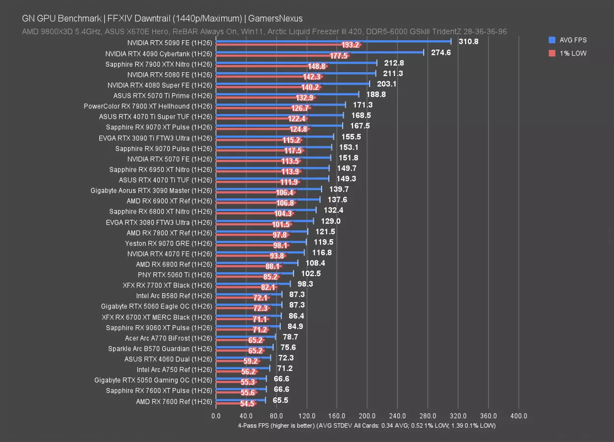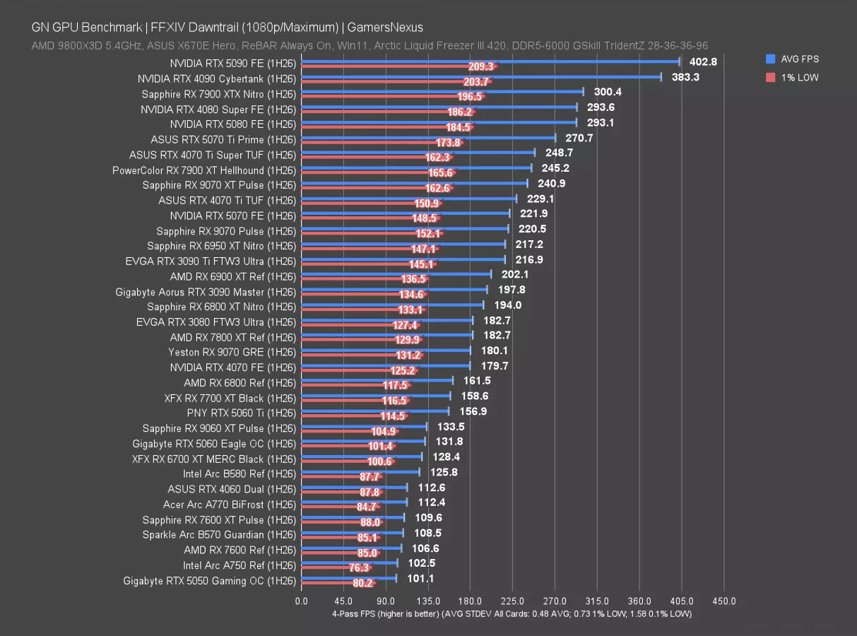 1080p isn’t that interesting, but we’ll show it briefly. The 5070 and 9070 are still about 4 FPS apart from each other. Otherwise, all we’re really seeing is the same scaling as earlier. Let’s move on.