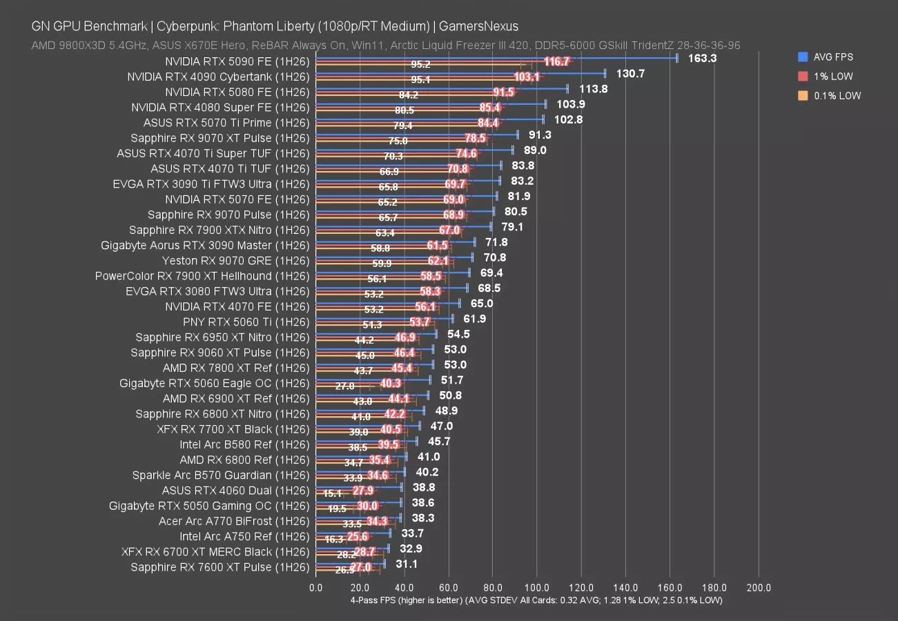 Cyberpunk is next. Given the 9070 GRE’s moderate performance, we’re only looking at our Medium RT settings results rather than Ultra.