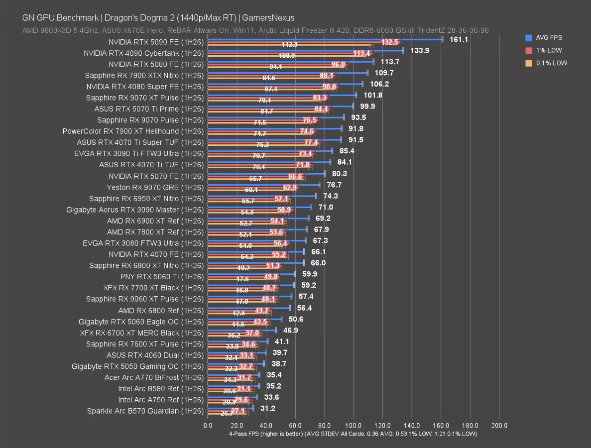 Dragon’s Dogma 2 rasterized is next. This test is load-intensive on the GPUs, especially at 4K, and establishes a wide range of results.