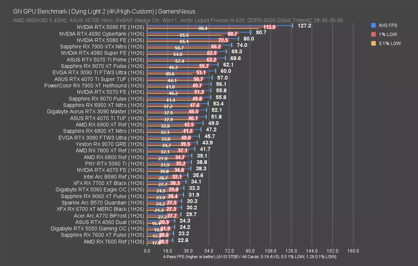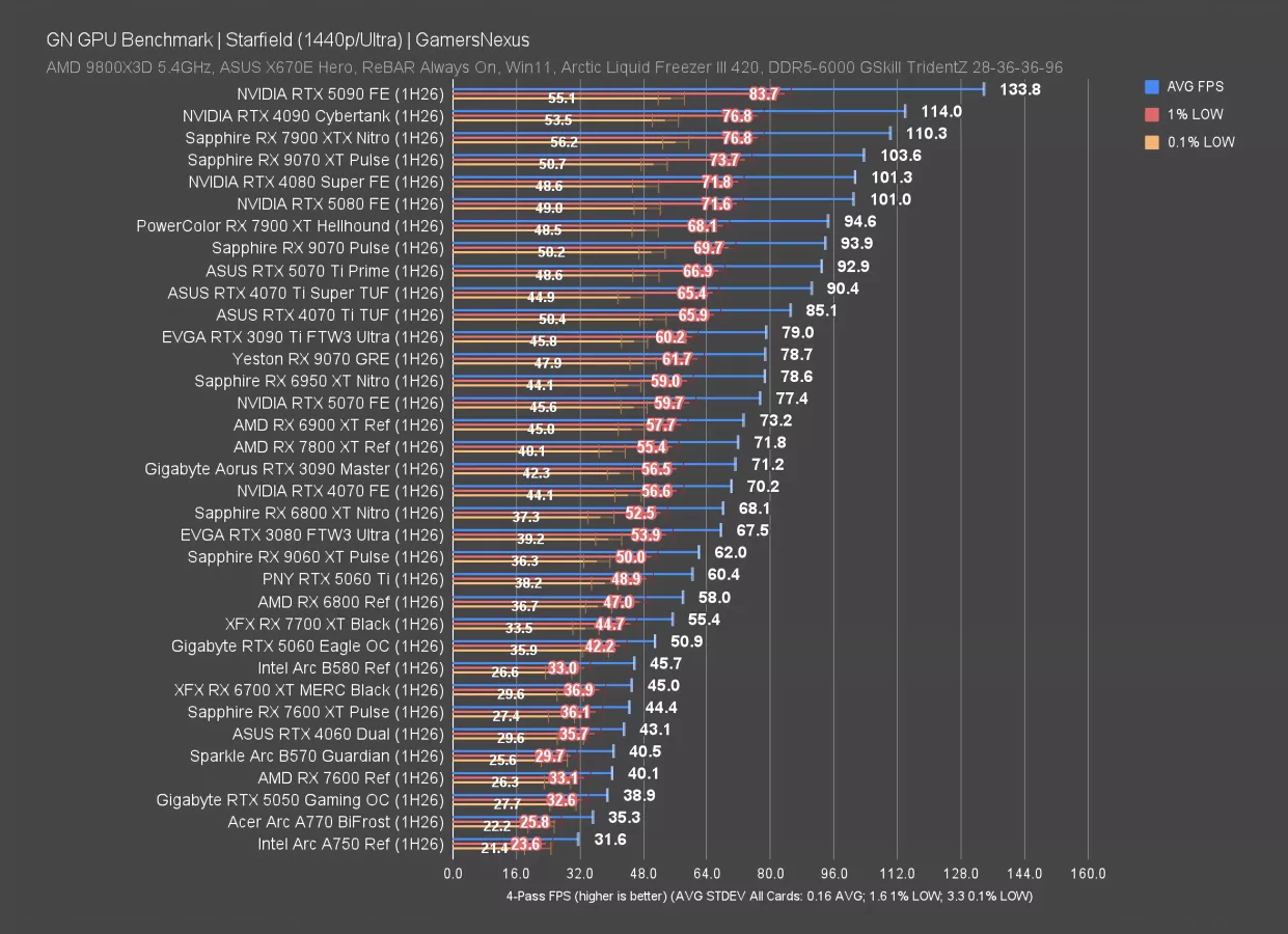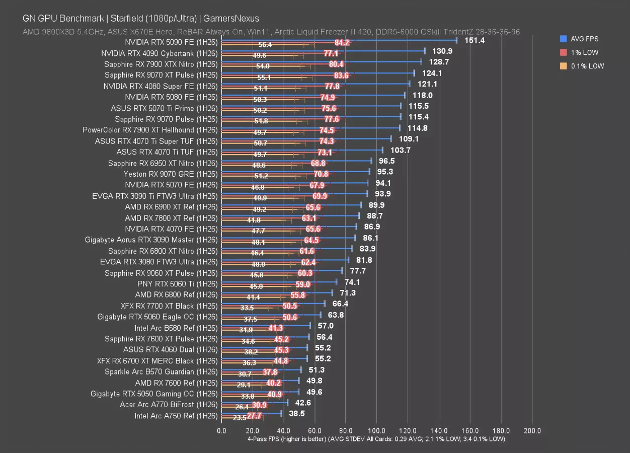 In Starfield at 4K, which is remarkably consistent (not that anyone would ever be playing it to notice), the 9070 GRE ran at 51 FPS AVG and had 1% and 0.1% lows consistent with neighbors. The 5070 ties the 9070 GRE, and actually, the 3090 Ti (watch our review) isn’t far ahead.