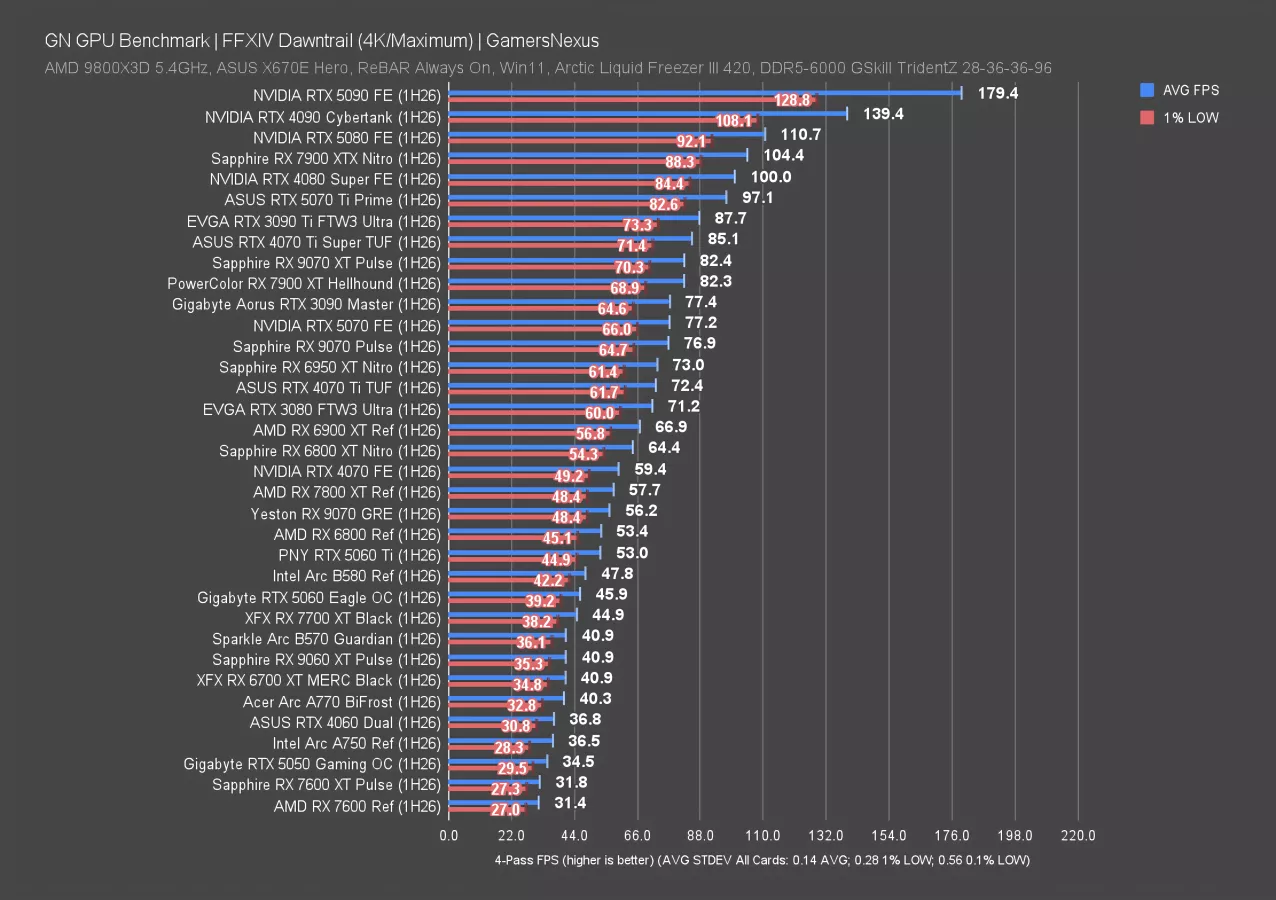 In Final Fantasy 14: Dawntrail at 4K, the RX 9070 XT ran at just 56 FPS AVG with maximum settings. The 7800 XT is functionally the same here. The RTX 5070 has a significant lead this time, now at 77 FPS AVG and leading both the 9070 non-GRE and the 9070 GRE. The advantage over the GRE is 37%. That’s the biggest leap we’ve seen so far from the 5070.