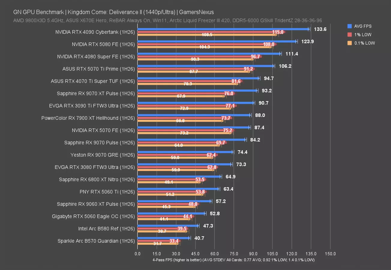 This next one is for Kingdom Come: Deliverance II, which is a new game to our test suite. The game launched in 2025 and is one of the newer titles we’ve added. Because this is brand new, we don’t have as many cards tested. The chart is more barren. On the positive side, this is one of the most consistent games we’re testing now, with the run-to-run variance often impressively below a 1 FPS change. That’s remarkably consistent.