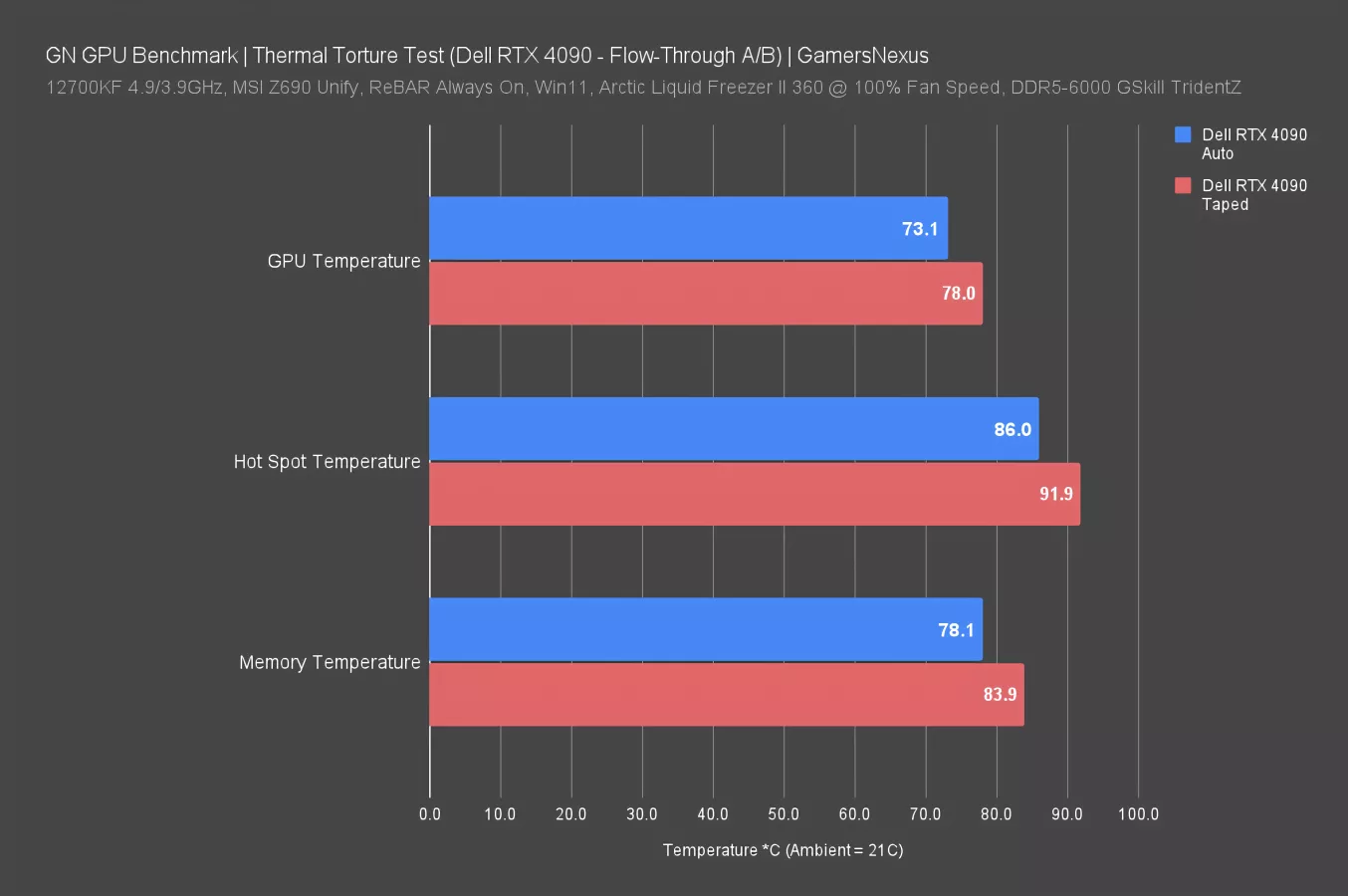Taping it over increased temperature by about 5 degrees Celsius across the board, plus or minus a little bit. The large flow-through area that Dell included does actually do something, and does clearly help the GPU thermals.