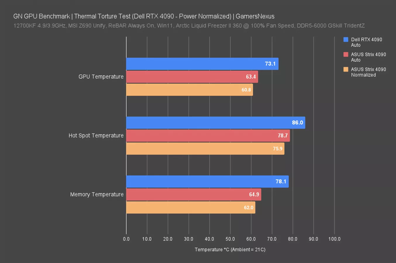 Again, the point isn’t to determine whether the Strix card is better -- it obviously is, and Dell wouldn’t disagree -- but just to provide a reference point for a barebones design versus one of the better partner models on the market. The most important factor though is that the Dell 4090 passed our thermal torture test, which is the most we seek from a barebones OEM design.