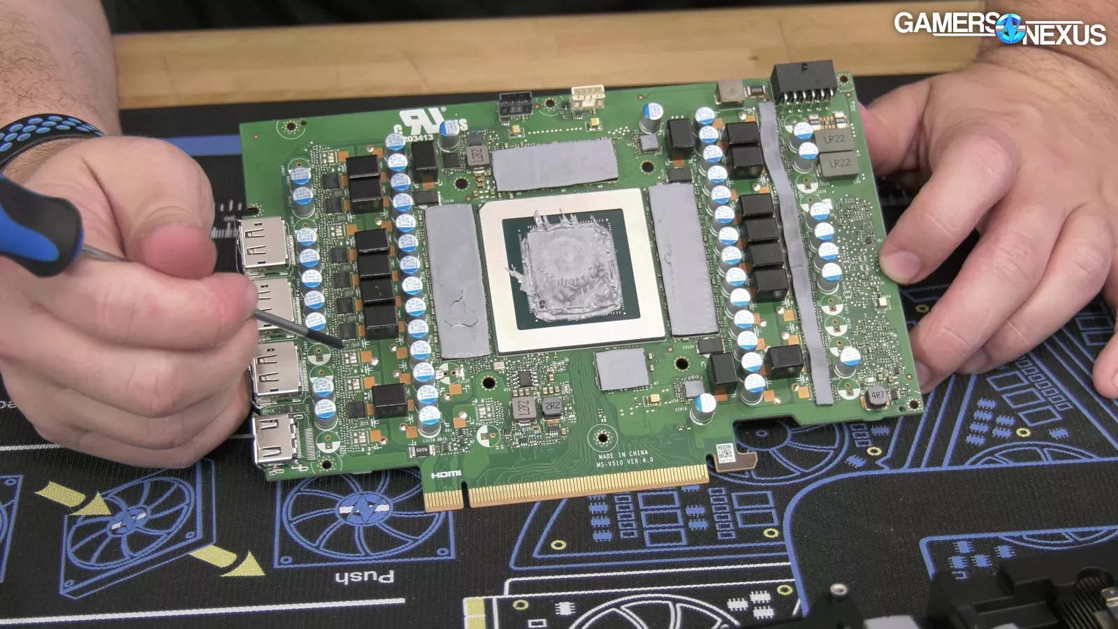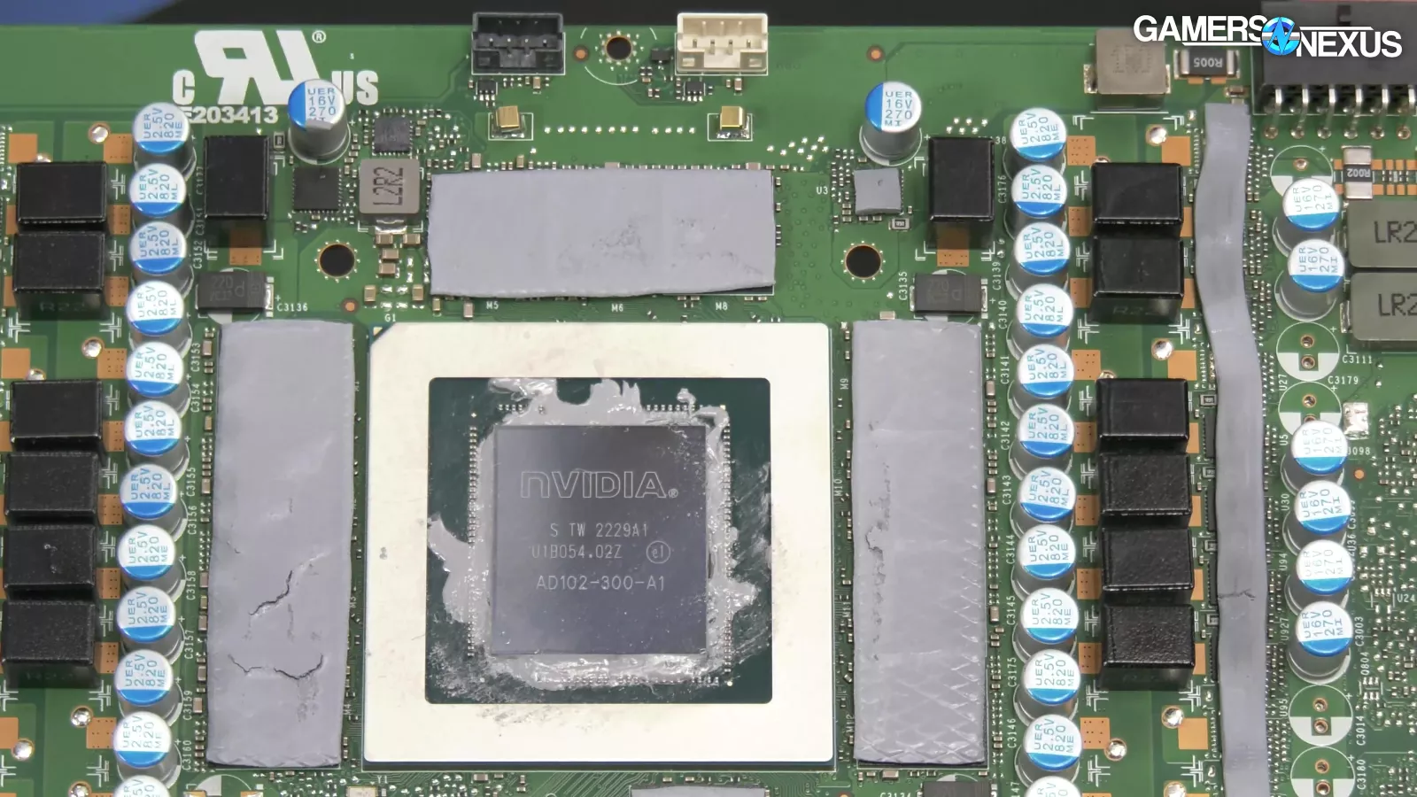 On the PCB, we noticed that there’s room to populate more capacitors, MOSFETs, inductors, and build additional VRM phases. This suggests there is headroom for a more powerful card like a 4090 Ti -- or they just down-costed it. On the GPU itself, we noticed that the thermal paste on it looks spread across in an oddly manual way. Cleaning off the thermal paste reveals the AD102-300-A1 die, which is to be expected for a 4090.