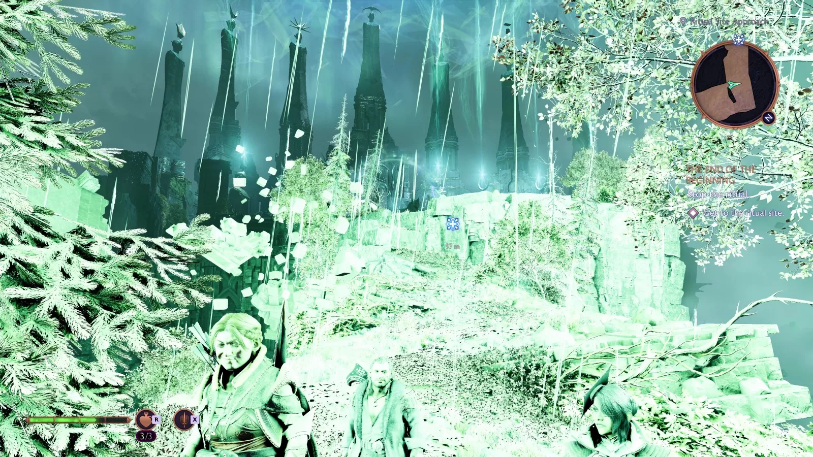 Using the lightning flash scene in Veilguard, we can see that our capture using the new model exhibits more distortion around the text on the right side of the screen and the waypoint in the center. As we advance forward to the first real frame with the lightning flash visible, we can see that the rendered keyframes are basically the same, so in theory, the generated frames should be as well. This could be a fluke, though, so let's check other scenes.