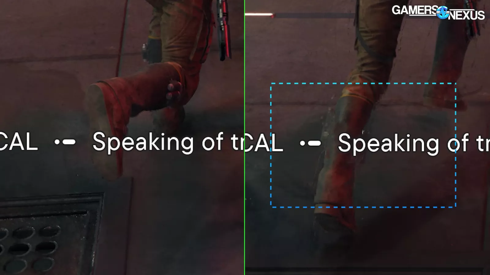Finally we have Jedi Survivor. This game has mandatory TAA, which makes isolating framegen artifacts more difficult, and it has no in-game render rate cap, so we had to use NVIDIA's driver controls. Still, we were at least able to get footage good enough for a framegen model comparison. The old model may be slightly worse about creating bright outlines as Cal moves across patches of darkness on the stairs and after jumping away from the billboard, but the new model creates broader smudges around his boots and a constant sketchy outline around his legs as he moves in front of lighter-colored surfaces. It also causes sparkles as Cal moves behind the white subtitle text, further UI issues that the older model doesn't exhibit to the same degree.