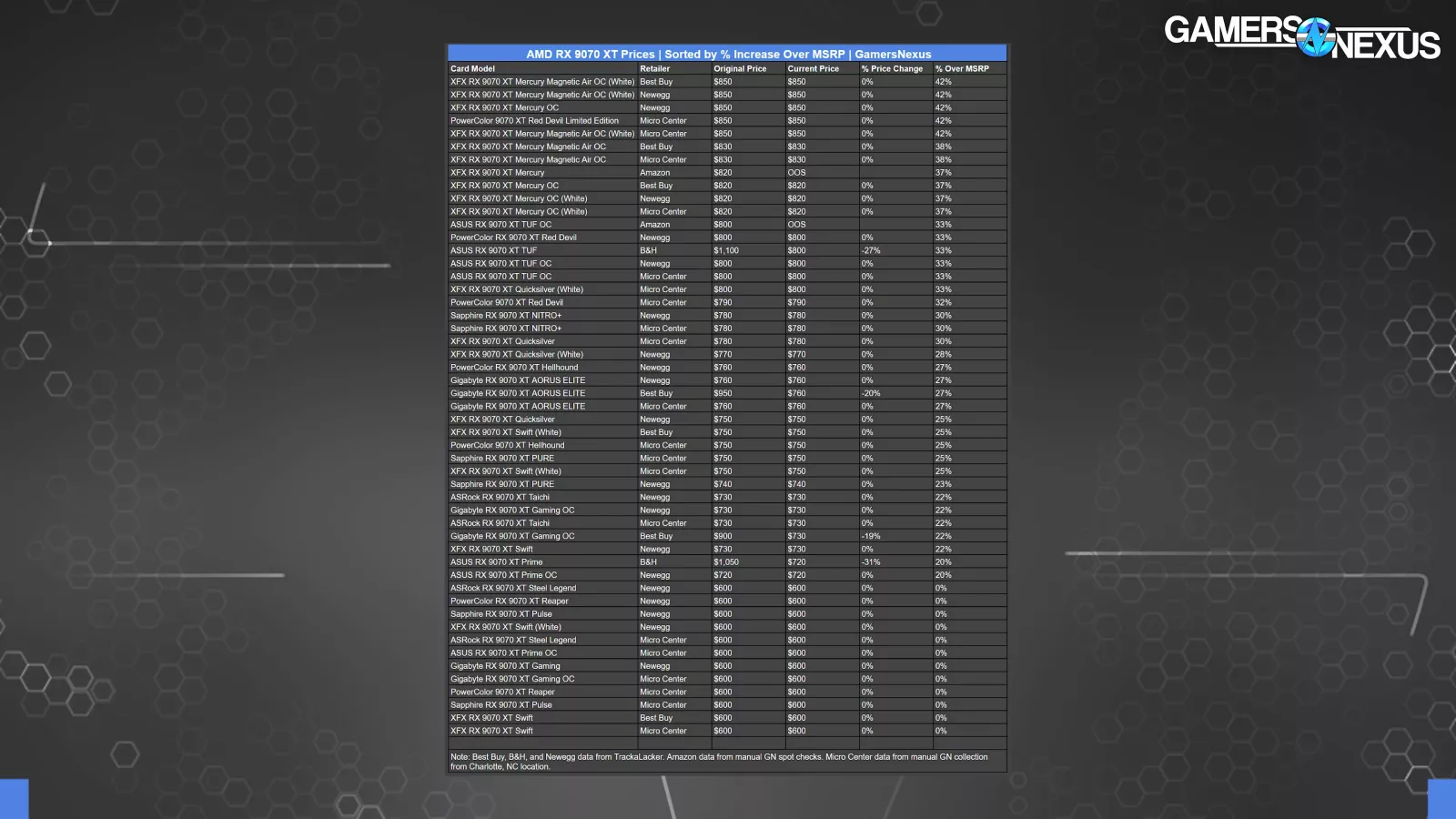 We prepared this table of RX 9070 XT (read our review) prices through a combination of data from TrackaLacker and some manual data collection. It shows the card model, retailer, original and updated price (if applicable), how much the price changed, and how much the price is elevated over the base MSRP of $600. Because of the way Amazon aggressively de-lists and removes prices, anything from Amazon is just what we came across in a spot check on the morning of launch. Pricing data may change by the time we publish due to a fluid market.