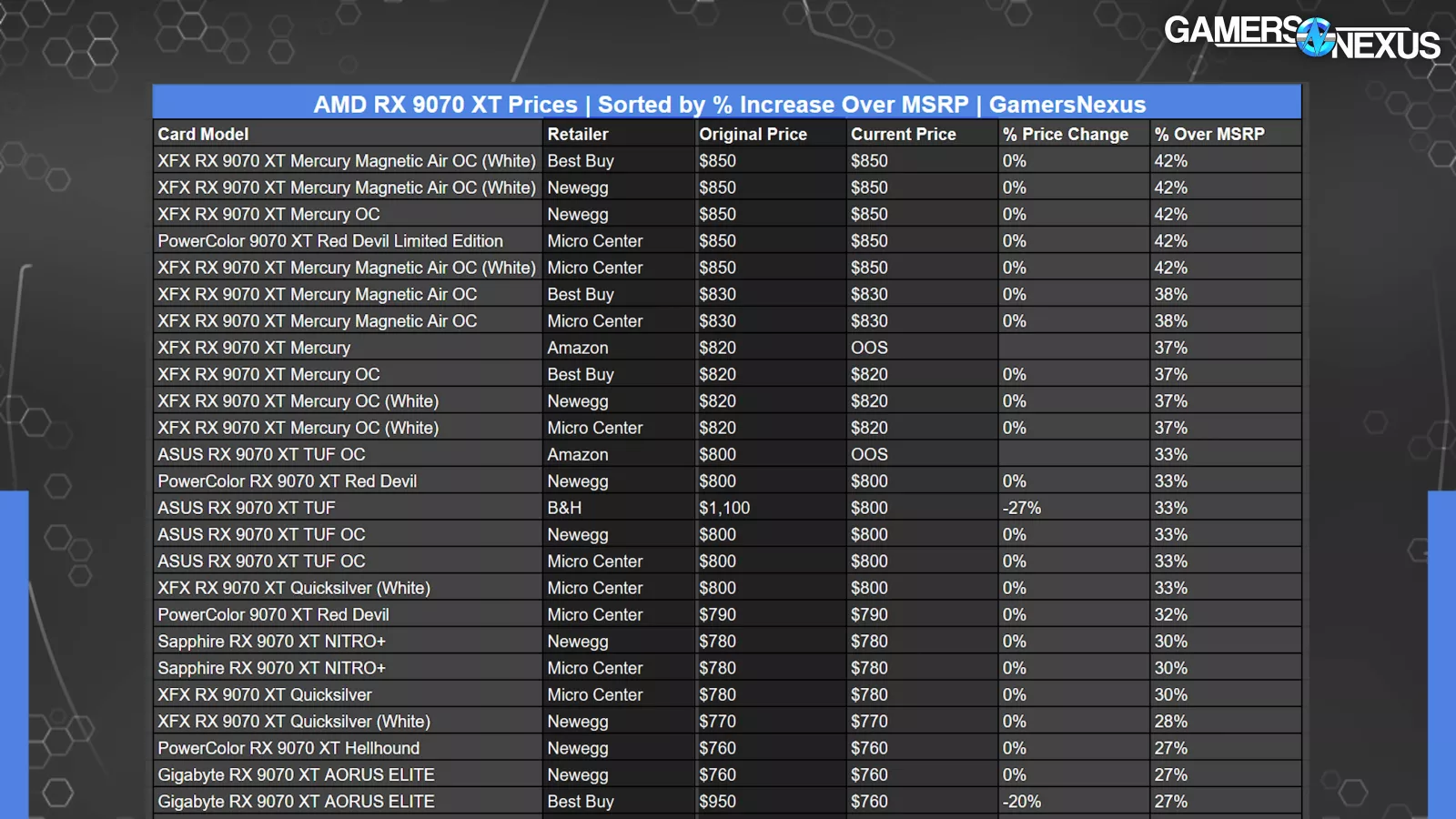 Overall, adding all the 9070 XTs and 9070s together, the average percent increase over MSRP is 19%. We don’t know whether that’s normal or not for AMD since this is the first time we’ve gathered that data for AMD, but we’ll bring up a point from our NVIDIA “Fake Prices” piece.
