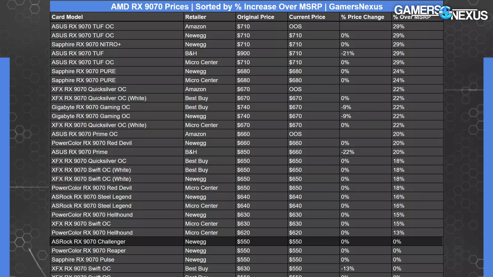 According to this detailed product listing sheet from the Dallas Microcenter, which is the only such one we were able to find, we observed 421 out of 920 cards, or roughly 46%, were sold at MSRP. More specifically, 319 of the 705 9070 XTs and 102 out of 215 9070s were listed with MSRP. This accounts for about 45.25% of 9070 XTs and nearly 47.5% for the non-XTs.