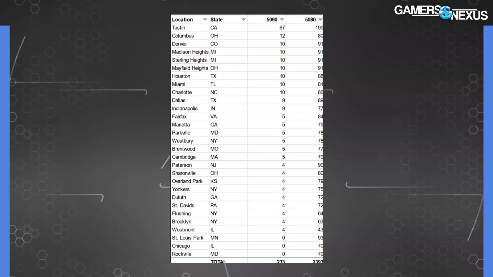 For reference, this spreadsheet circulated on Reddit after users tallied the Micro Center inventories for the 50-series launch day. The Madison Heights and Sterling Heights stores are actually the same, so subtracting those 10 duplicate entry units from the 5090s and 91 units from the 5080s (read our review), we end up with 223x RTX 5090s and 2,302 RTX 5080s for launch day.