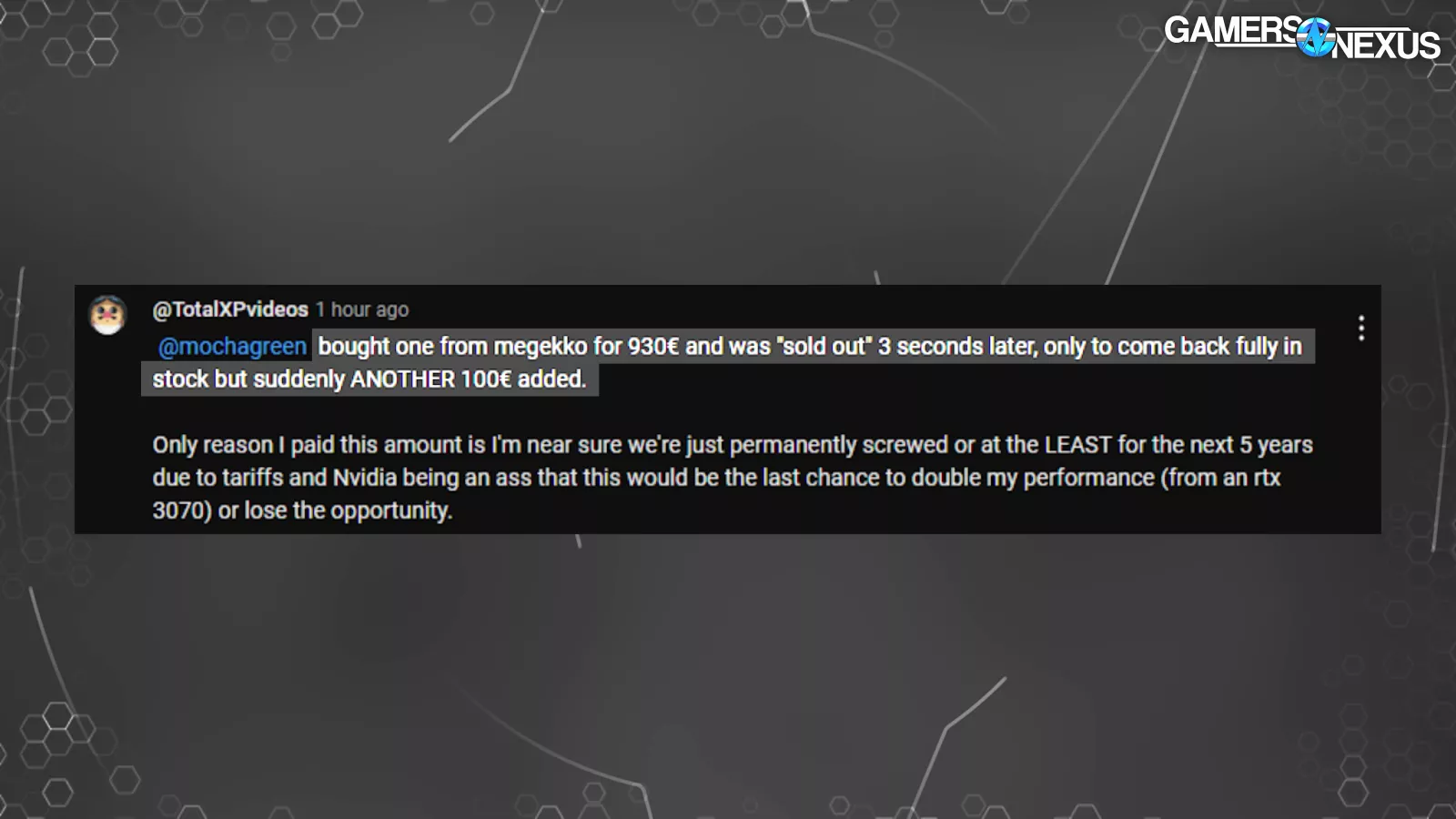 Another states, “Bought one from megekko for 930€ and was ‘sold out’ 3 seconds later, only to come back fully in stock but suddenly ANOTHER 100€ added.”