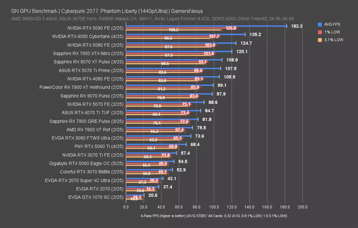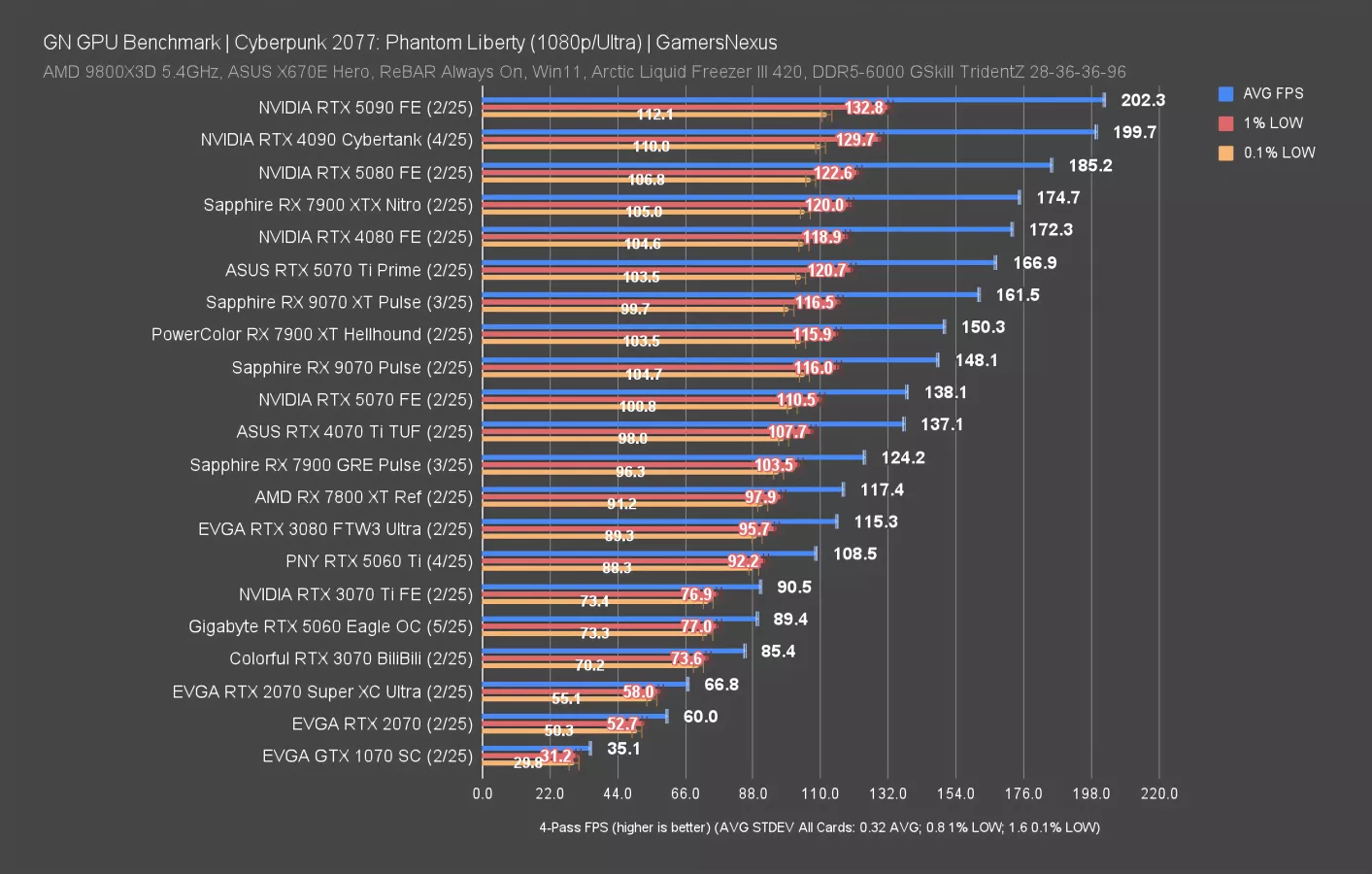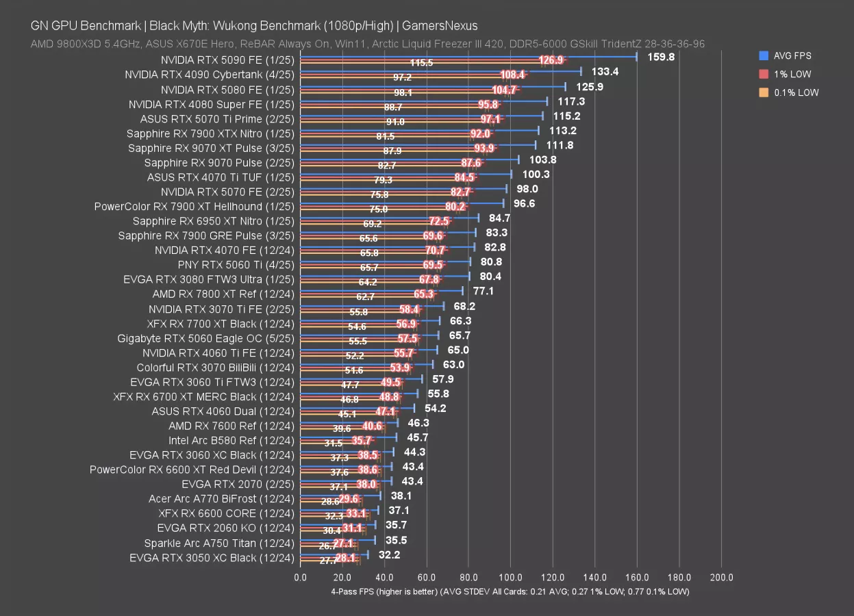 At 1080p, the RTX 5060 moves up to 89 FPS AVG and remains sandwiched by the 3070 and 3070 Ti. We haven’t re-run the 4060 through this test lately, but the 9060 XT will definitely be an interesting data point to see.