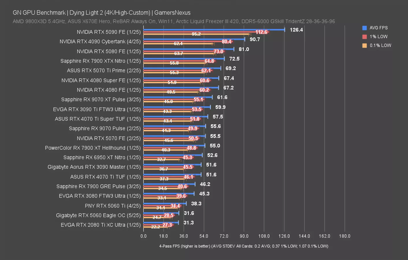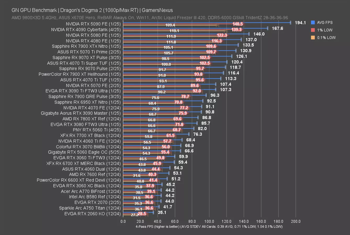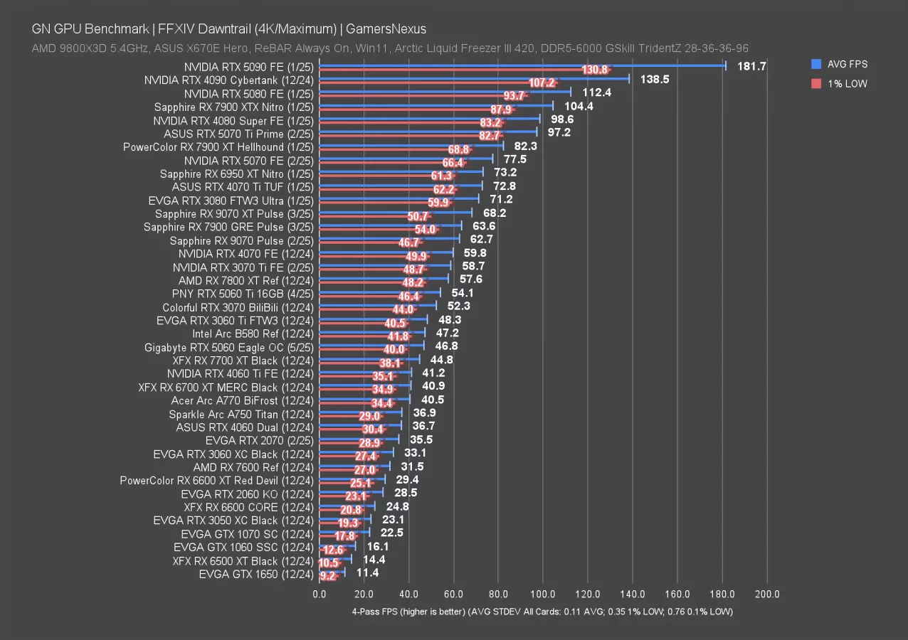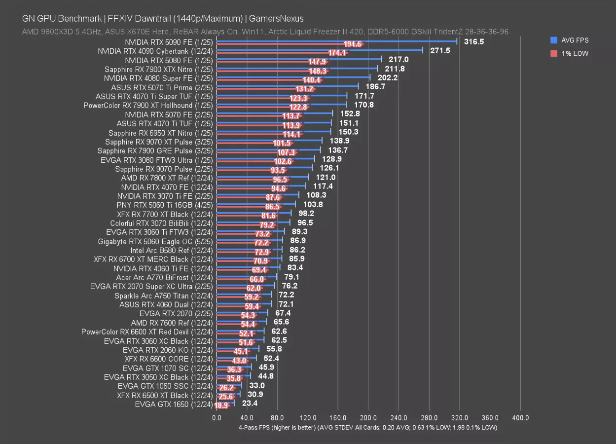 Final Fantasy 14: Dawntrail is up now, first at 4K. This particular set of tests is a weaker showing for the AMD RX 90 series, as we’ve shown in the 9070 XT review and 9070 review. NVIDIA is mostly competing against itself.