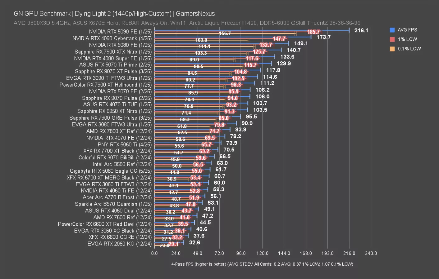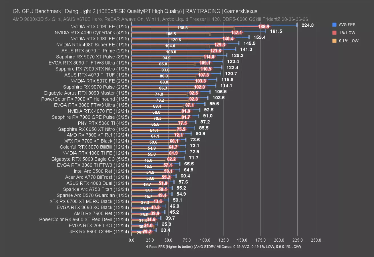 Dying Light 2 with ray tracing and at 1440p upscaled is next. In this one, the RTX 5060 ran at 49 FPS AVG, with the 5060 Ti ahead by 22%. AMD does comparatively better in this one versus its Black Myth performance earlier, but we need to go down to 1080p for more cards.