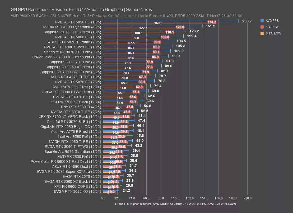 Resident Evil 4 at 4K is up now, this time ray traced and with upscaling. The RTX 5060 ran at 55 FPS AVG, again roughly tying it with a 3070 and 6700 XT. The 5060 Ti is again around 22% better than the 5060 in average FPS here, with lows improved proportionally.