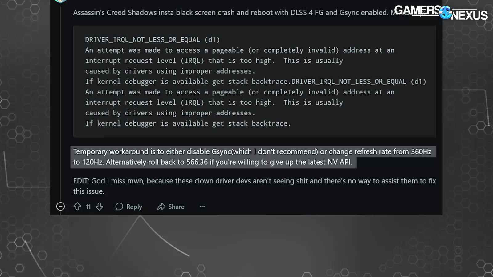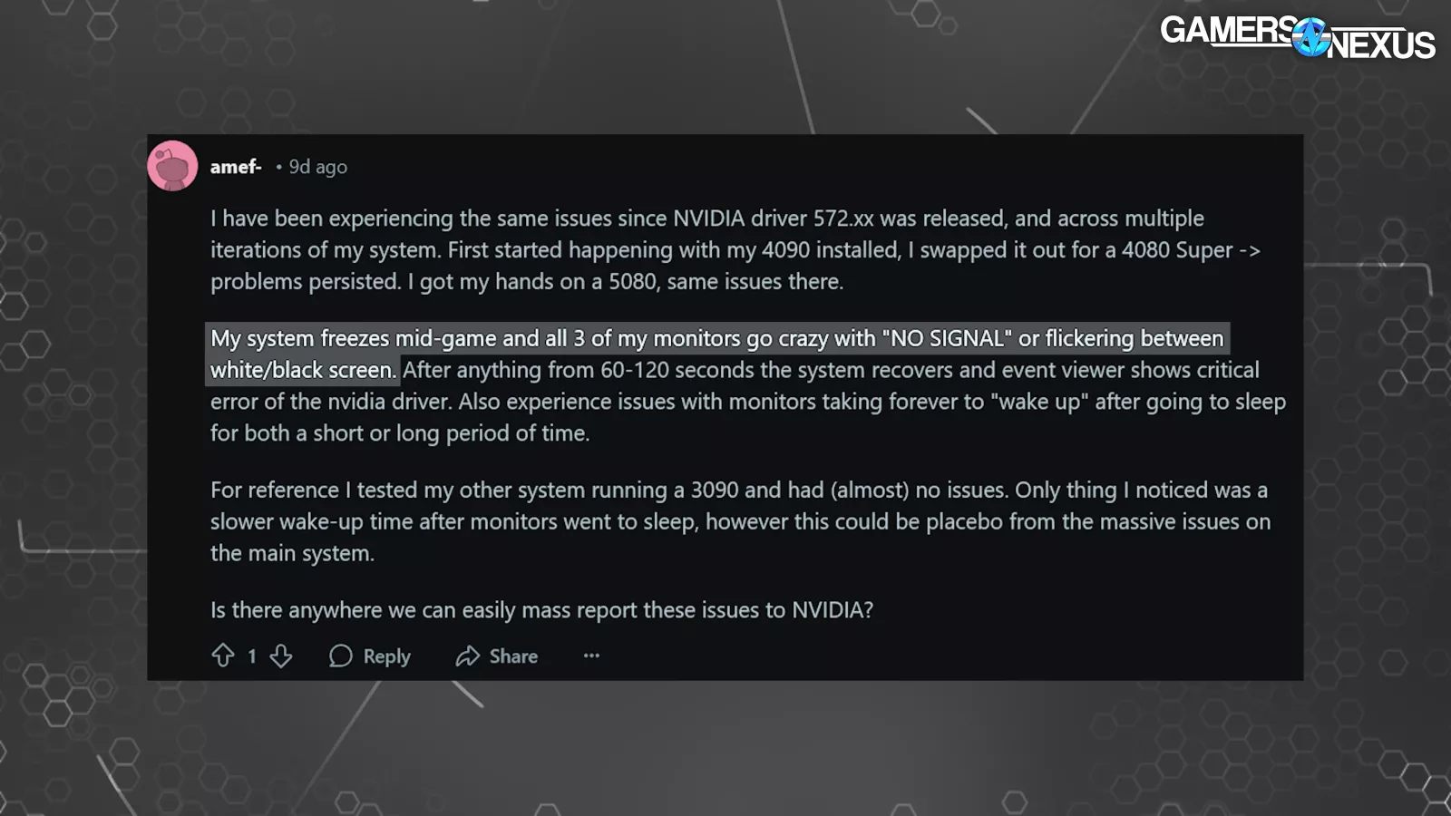 Several users speculated on the impact of multiple monitors, the impact of mixed or higher refresh rates, and even how NVIDIA’s own G-Sync might be affecting the driver stability.