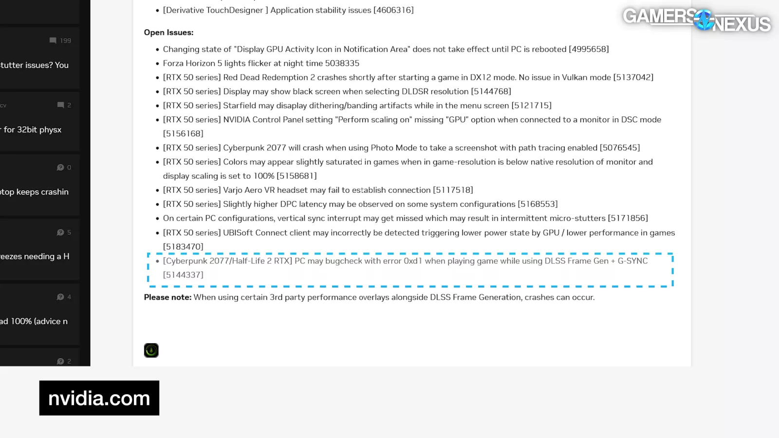 In NVIDIA’s 572.83 driver release notes, one open issue states, “[Cyberpunk 2077/Half-Life 2 RTX] PC may bugcheck with error 0xd1 when playing game while using DLSS Frame Gen + G-SYNC [5144337].”