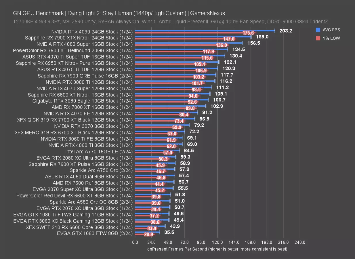 1440p stretches the scale to the point that the 1080 Ti now falls below 60 FPS. If we choose 60 FPS as a somewhat arbitrary line of scrimmage, the first card that passes it is the A770 on this chart, with the 7600 XT and 2080 close enough. For non-Intel, you might consider the 4070 or 7800 XT as meaningfully improved over the 1080 Ti, but probably with less staying power than you benefited from on the 1080 Ti.