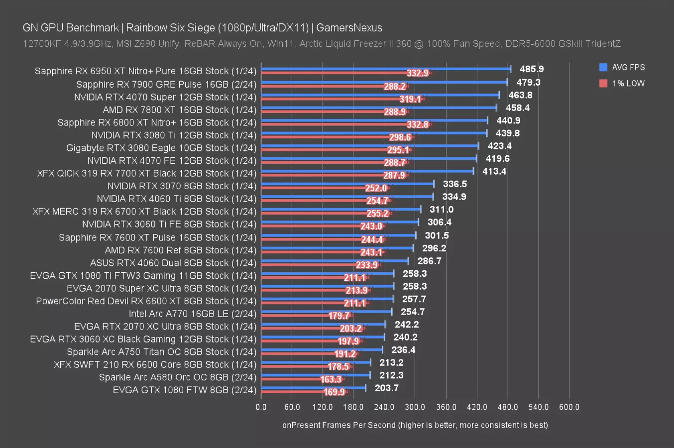 At 1440p, the GTX 1080 still holds 130 FPS AVG in Rainbow Six Siege, with the GTX 1080 Ti continuing to impress and earn its GOAT title, all 7 years later, with a performance equivalent to the 2070 Super and besting the modern A750 (read our revisit here). Noteworthy entries on this one remain the RTX 3080, which would still give a huge upgrade pathway while potentially running cheap if you’re willing to trust a used listing. The new RX 7900 GRE also jaunts ahead for something at a balanced price.
