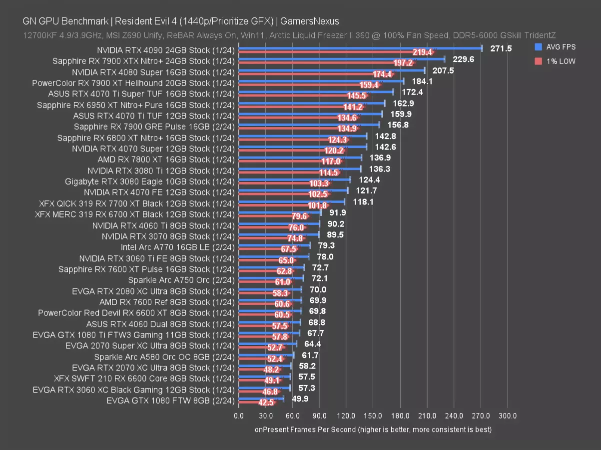 We're about to get into the individual game test just to give some foundational data with more charts. There aren’t ray tracing charts here because the 1080 Ti does not natively or meaningfully support realtime ray tracing in modern games. Because of that, there's not really anything to test. For ray tracing results, just look at the RT charts in our 7900 GRE review or any other recent GPU review.