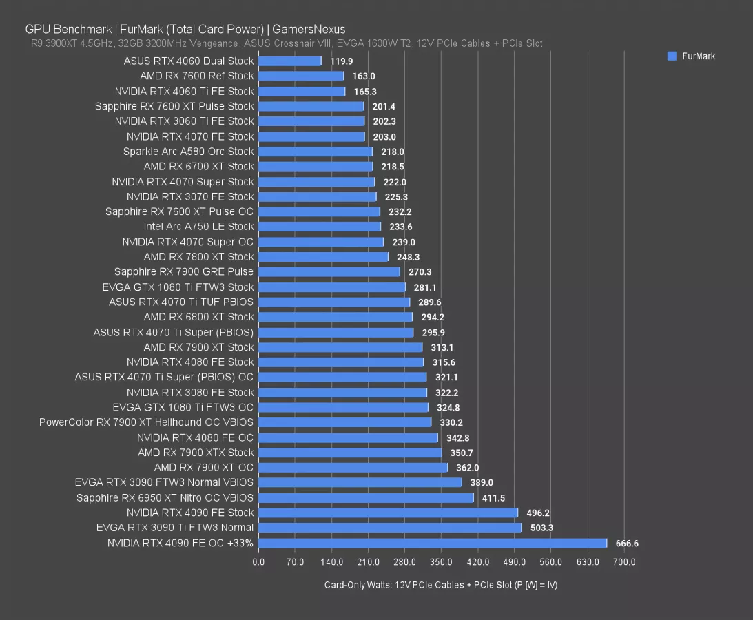 With an overclock, we had the 1080 Ti at 325W. That’s another aspect that GOATed the card: Its OC headroom was often enormous, with board partners more enabled to expand the total power budget than you’ll often find today. This has it around the 7900 XT and 3080.