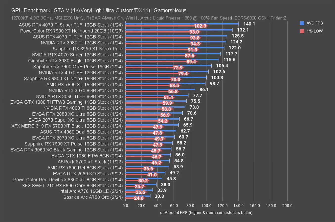 Finally, in GTA V, the 1080 held a 56 FPS AVG and was between the 5700 XT (watch our review here) and 3060 at 4K. The 1080 Ti continues to impress and outmatches the 4060 Ti. It’s a hell of a show from Pascal.