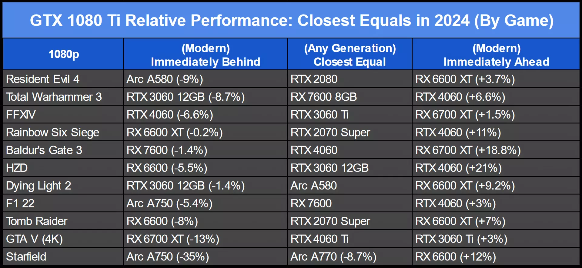 This is one of those scenarios where anything would be an upgrade. Generally speaking, you can expect somewhere around a 120-150% uplift with a 4070 Ti Super across these suite of games. The 4080 Super (read our review here), roughly speaking, would give you around 170-190% uplift. The XT is around the 140-160% for uplift, with the XTX at 190-210% or so broadly speaking. Each of these has several break-outs, including the 7900 XTX spiking upwards of 300% improvement in Starfield. At that point, percentages don’t feel like they mean anything anymore. Suffice to say, it’s an entirely different experience. You should basically be choosing between the modern cards that you're considering rather than necessarily comparing them to the 1080 Ti because all of these are going to be massive changes in the experience but it's still fun to look back and get a feel for it this way.