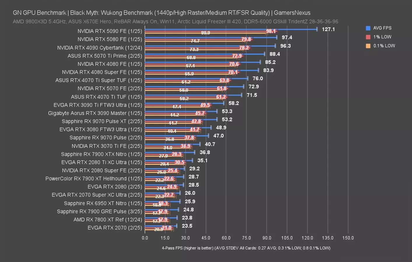 The RTX 5070 crushes the 9070 here, holding a 57% lead over the AMD GPU. The 5070 Ti’s scaling over the 9070 XT was better and nearly 80%, but 57% is still huge for the 5070 over the 9070. If you want to play Black Myth with ray tracing, like we said in the 9070 XT review, you basically only buy NVIDIA.