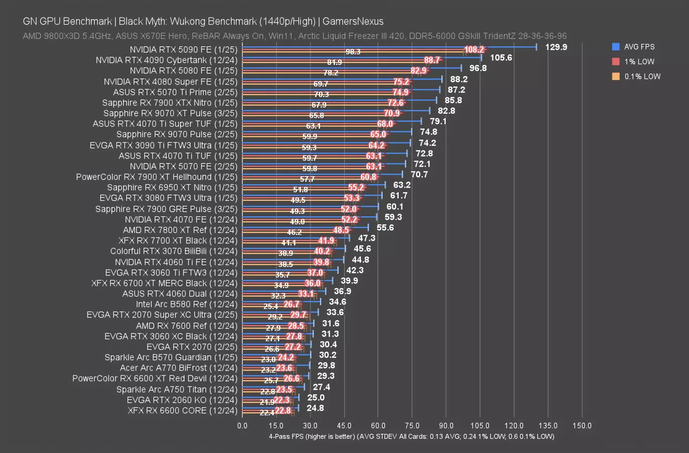 At 1440p, the RX 9070 ran at 96 FPS AVG and nearly tied the 4070 Ti Super again. The 5070 Ti outperforms the 9070 by a lame 5.4%, with the 9070 XT outperforming the 9070 by 10%.